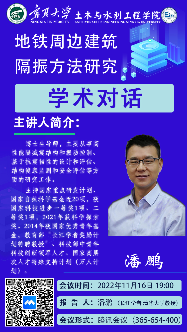 潘鹏,清华大学教授,博士生导师。曾在清华大学获得学士和硕士学位,日本京都大学获得博士学位。兼任中国土木工程学会防震减灾工程分会副会长、中国工程建设标准化协会抗震专业委员会副秘书长等职务。主要从事高性能隔减震结构和振动控制方法、基于抗震韧性的设计和评估方法、大型复杂结构抗震实验技术和地震响应分析方法、基于信息技术的结构健康监测和安全评估等方面研究工作。
