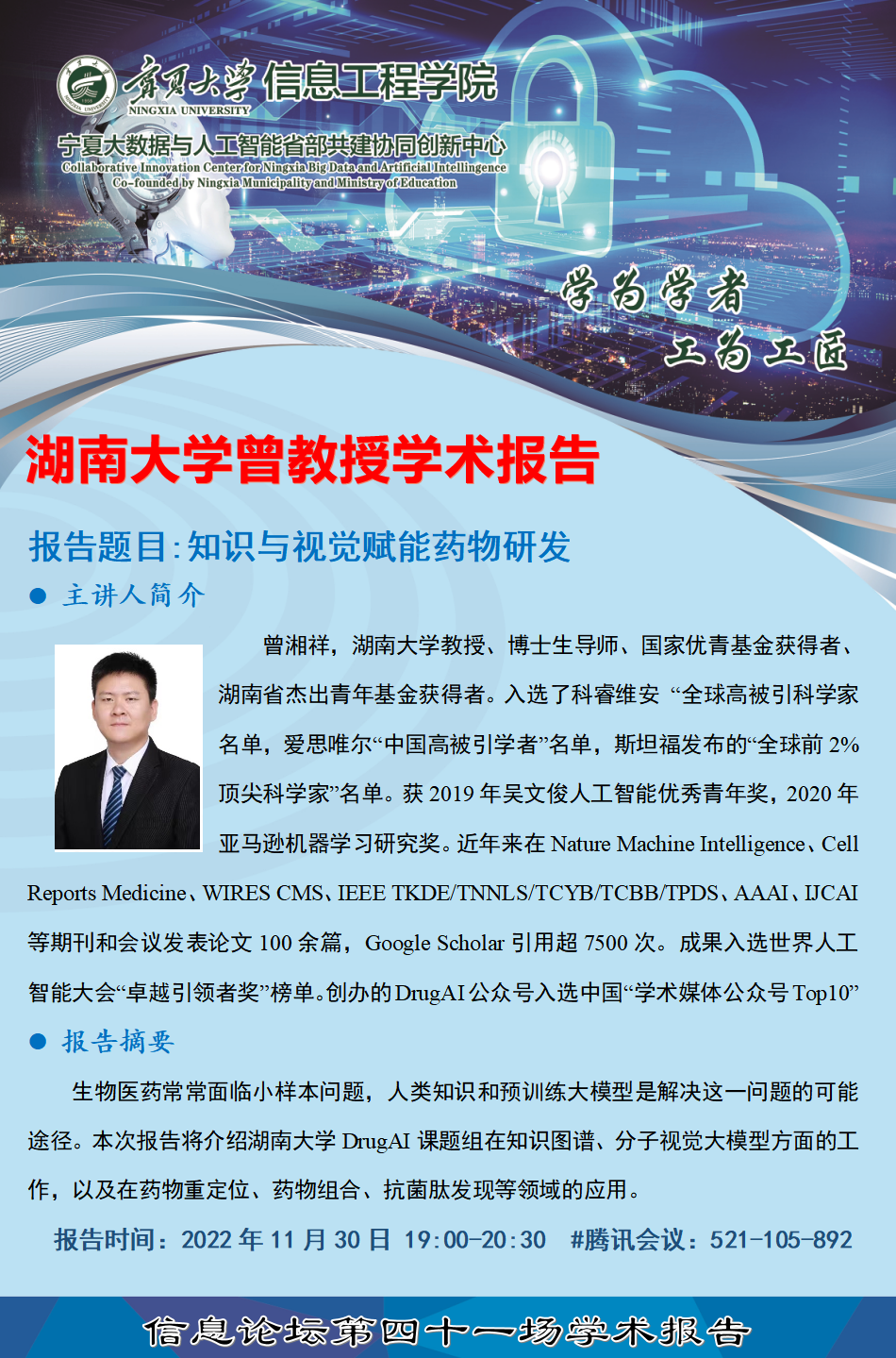 曾湘祥,湖南大学教授、博士生导师、国家优青基金获得者、湖南省杰出青年基金获得者。入选了科睿维安“全球高被引科学家”名单,爱思唯尔“中国高被引学者”名单,斯坦福发布的“全球前2%顶尖科学家”名单。获2019年吴文俊人工智能优秀青年奖,2020年亚马逊机器学习研究奖。近年来在Nature Machine Intelligence、Cell Reports Medicine、WIRES CMS、IEEE TKDE/TNNLS/TCYB/TCBB/TPDS、AAAI、IJCAI等期刊和会议发表论文100余篇,Google Scholar引用超7500次。成果入选世界人工智能大会“卓越引领者奖”榜单。创办的DrugAI公众号入选中国“学术媒体公众号Top10”。