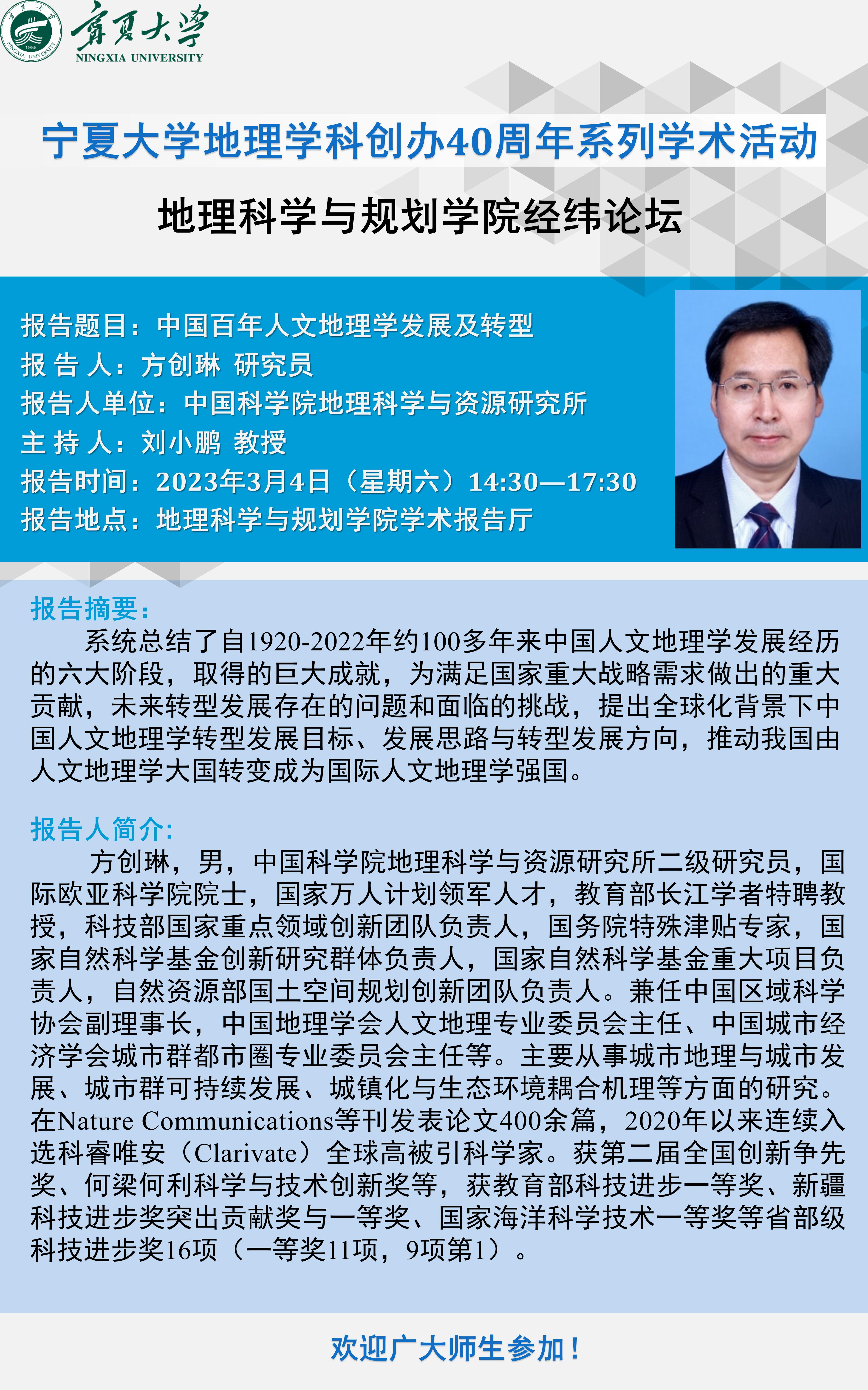 方创琳,男,中国科学院地理科学与资源研究所二级研究员,国际欧亚科学院院士,国家万人计划领军人才,教育部长江学者特聘教授,科技部国家重点领域创新团队负责人,国务院特殊津贴专家,国家自然科学基金创新研究群体负责人,国家自然科学基金重大项目负责人,自然资源部国土空间规划创新团队负责人。兼任中国区域科学协会副理事长,中国地理学会人文地理专业委员会主任、中国城市经济学会城市群都市圈专业委员会主任等。主要从事城市地理与城市发展、城市群可持续发展、城镇化与生态环境耦合机理等方面的研究。在Nature Communications等刊发表论文400余篇,2020年以来连续入选科睿唯安(Clarivate)全球高被引科学家。获第二届全国创新争先奖、何梁何利科学与技术创新奖等,获教育部科技进步一等奖、新疆科技进步奖突出贡献奖与一等奖、国家海洋科学技术一等奖等省部级科技进步奖16项(一等奖11项,9项第1)。