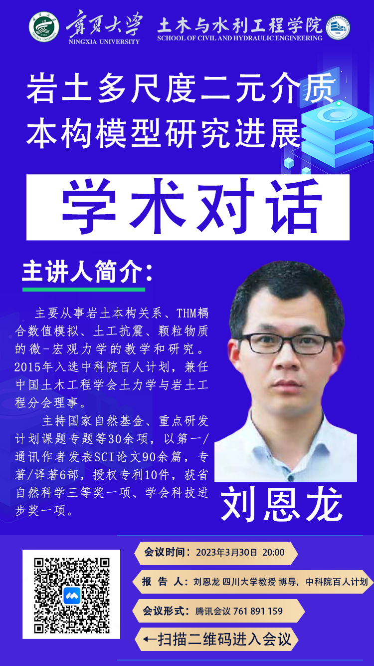 刘恩龙,博士,四川大学教授,博士生导师。曾工作于新加坡国立大学和墨尔本大学。2015年入选中科院百人计划,兼任中国土木工程学会土力学与岩土工程分会理事、期刊Bulletin of Engineering Geology and the Environment编委等。长期从事岩土本构关系、THM耦合数值模拟、土工抗震、颗粒物质的微-宏观力学的教学和研究。以第一/通讯作者发表SCI论文90余篇,主要发表在International Journal of Plasticity、Mechanics of Materials、Acta Geotechnica、Canadian Geotechnical Journal、International Journal of Rock Mechanics &Mining Science等期刊;合著专/译著6部,授权专利10件、软著3件,参与起草国家能源行业标准1部;获省自然科学三等奖一项、学会科技进步奖一项。主持国家自然基金、重点研发计划课题专题和企业委托项目等30余项科研项目。曾是国家自然基金委工程与材料学部重大项目、国家重点研发计划、国家863计划等评审专家。