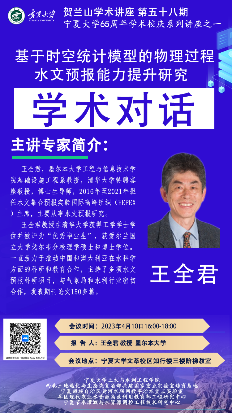 王全君,墨尔本大学教授、清华大学杰出访问教授。王教授在推动中澳两国在水资源研究和教育方面的合作中有着杰出贡献。在过去的15年中带领了许多水预报研究项目,与澳大利亚国家气象局和水务行业有着非常密切的合作,并为澳大利亚国家水文预报的落地应用做出了重要贡献。2018年带领独立专家团审评基于澳大利亚墨累-达令流域(Murray-Darling Basin)规划下实施的地下水可持续引水限制和灌溉效率项目对河流流量的潜在影响。2019-2020年带领专家团评审气象局水文建模现状并建议发展方向,对气象局的科学研究,技术开发和业务服务有着长远和决定性的影响。已发表150多篇期刊论文,并在2016年至2021年担任集合水文预报的国际研究和实践高峰社区HEPEX的联合主席。王全君教授将系统介绍其团队近些年在基于统计时空模型提升物理过程模型的预测水平领域的国际前缘研究成果。