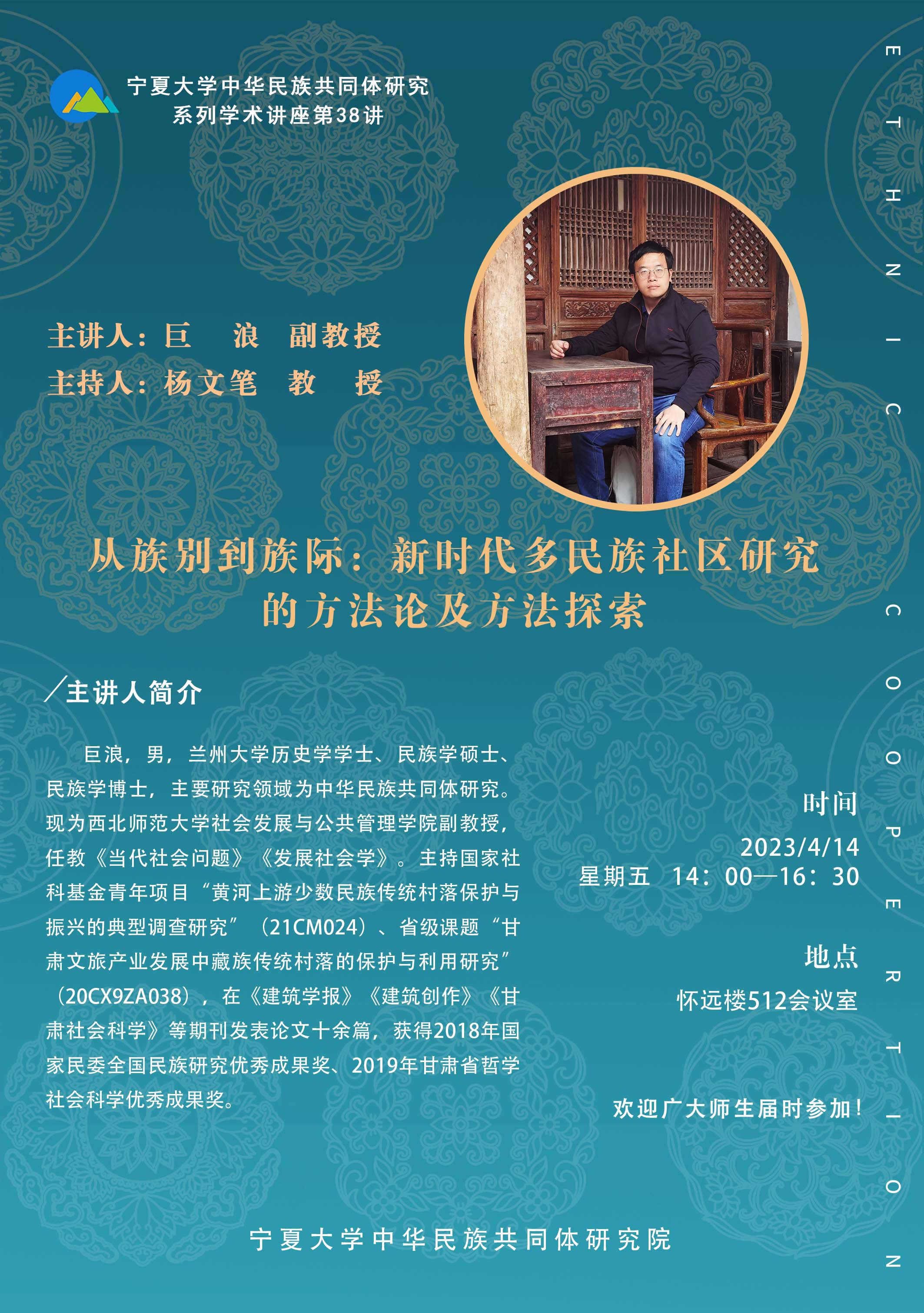 巨浪,男,兰州大学历史学学士、民族学硕士、民族学博士,主要研究领域为中华民族共同体研究。现为西北师范大学社会发展与公共管理学院副教授,任教《当代社会问题》《发展社会学》。主持国家社科基金青年项目“黄河上游少数民族传统村落保护与振兴的典型调查研究”(21CM024)、省级课题“甘肃文旅产业发展中藏族传统村落的保护与利用研究”(20CX9ZA038),在《建筑学报》《建筑创作》《甘肃社会科学》等期刊发表论文十余篇,获得2018年国家民委全国民族研究优秀成果奖、2019年甘肃省哲学社会科学优秀成果奖。