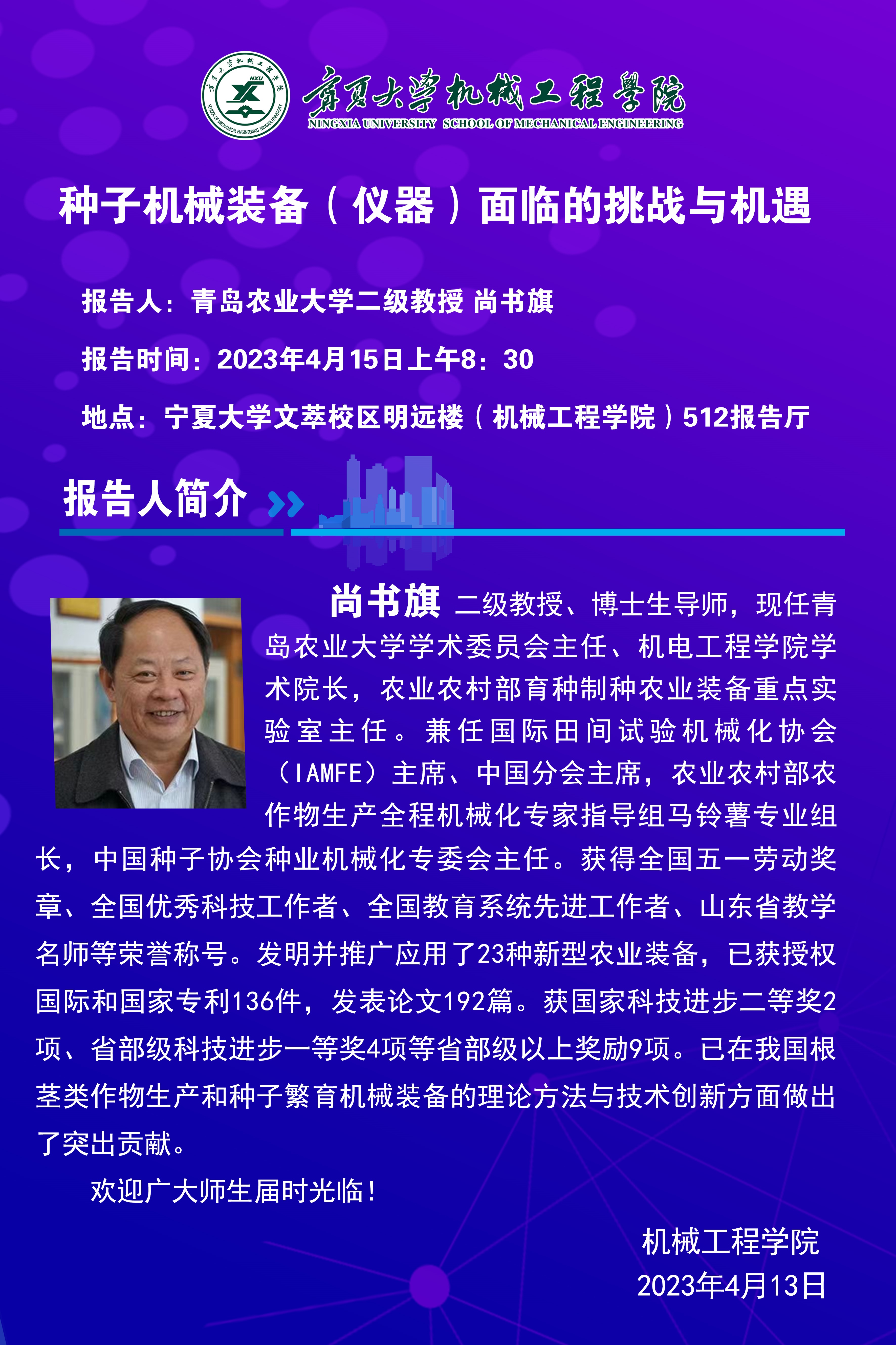 尚书旗,二级教授、博士生导师,现任青岛农业大学学术委员会主任、机电工程学院学术院长,农业农村部育种制种农业装备重点实验室主任。兼任国际田间试验机械化协会(IAMFE)主席、中国分会主席,农业农村部农作物生产全程机械化专家指导组马铃薯专业组组长,中国种子协会种业机械化专委会主任。获得全国五一劳动奖章、全国优秀科技工作者、全国教育系统先进工作者、山东省教学名师等荣誉称号。发明并推广应用了23种新型农业装备,已获授权国际和国家专利136件,发表论文192篇。获国家科技进步二等奖2项、省部级科技进步一等奖4项等省部级以上奖励9项。已在我国根茎类作物生产和种子繁育机械装备的理论方法与技术创新方面做出了突出贡献。