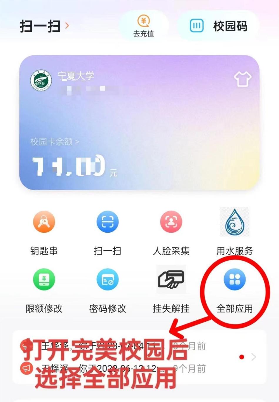 1.打开完美校园APP进入首页后选择全部应用;
