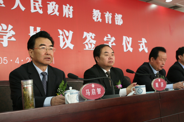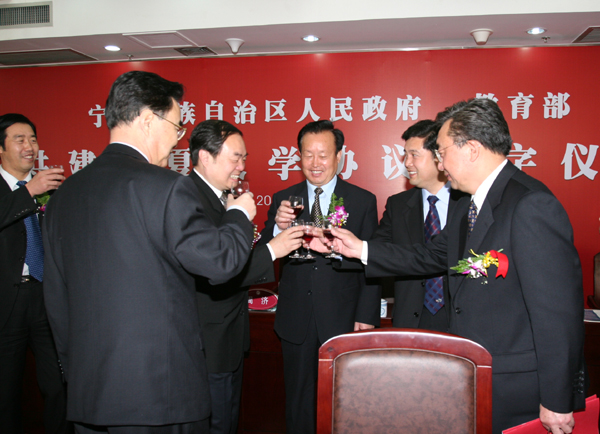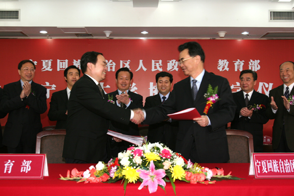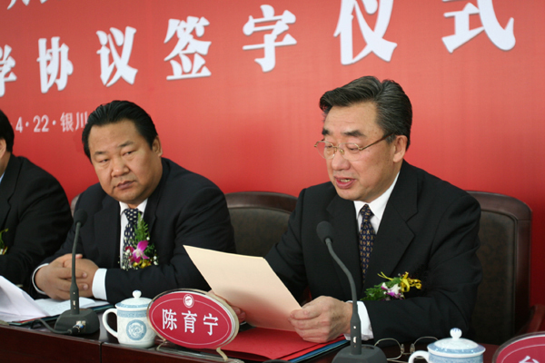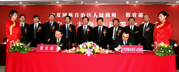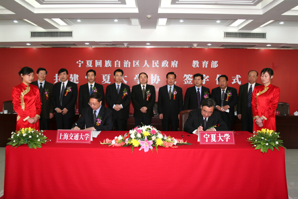4月22日上午,宁夏回族自治区人民政府、教育部共建beat365唯一官方网站协议签字仪式在beat365官网隆重举行。自治区主席马启智、教育部部长周济分别在协议书上签字。自治区党委书记陈建国,自治区党委常委、副主席王正伟,自治区党委常委、秘书长于革胜,自治区副主席刘仲,自治区政协副主席、beat365唯一官方网站党委书记、校长陈育宁,上海交通大学校长谢绳武,自治区政府秘书长魏锡良等领导出席了签字仪式。