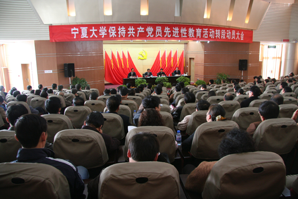 10月26日,beat365官网召开保持共产党员先进性教育活动分析评议阶段总结暨整改提高阶段动员大会。各党总支、直属党支部书记,教职工、学生党员代表,部分离退休党员、民主党派人士及自治区党委高校督导组的同志300多人参加了大会。校党委书记、校长陈育宁同志作转段动员报告,自治区党委派驻高校先进性教育活动督导组组长马万禄同志作了讲话。