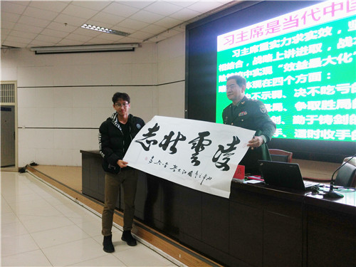 在互动环节,李兵教授与学生亲切交谈,对同学们提出的疑问,他从历史、军事、国家安全等角度出发一一进行了详细解答,并将自己的书法作品赠与学生。他用自身丰富的人生经历和人格魅力言传身教,勉励同学们努力掌握科学文化知识,认真学习弘扬长征精神,做祖国忠实的拥护者、保卫者、建设者。