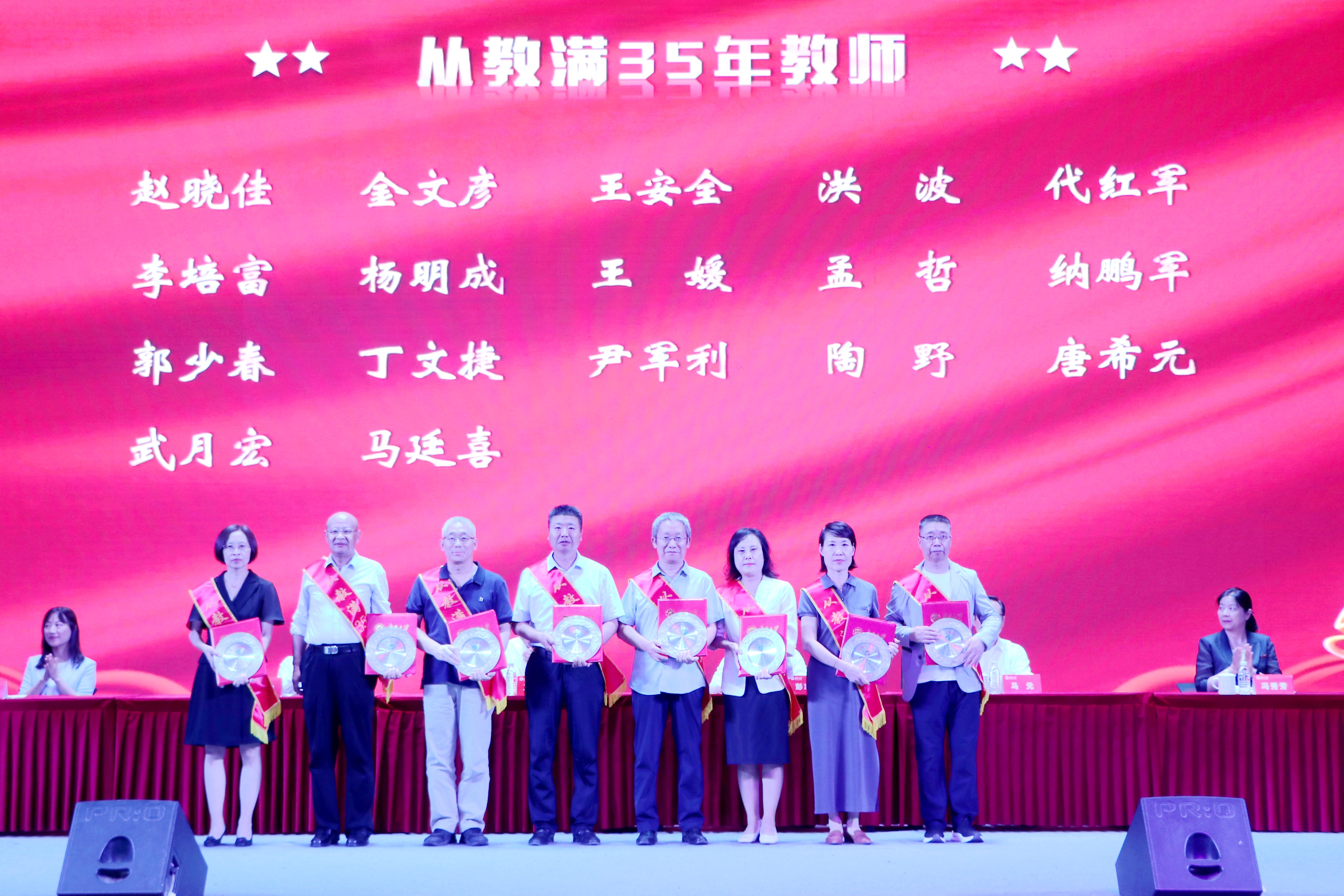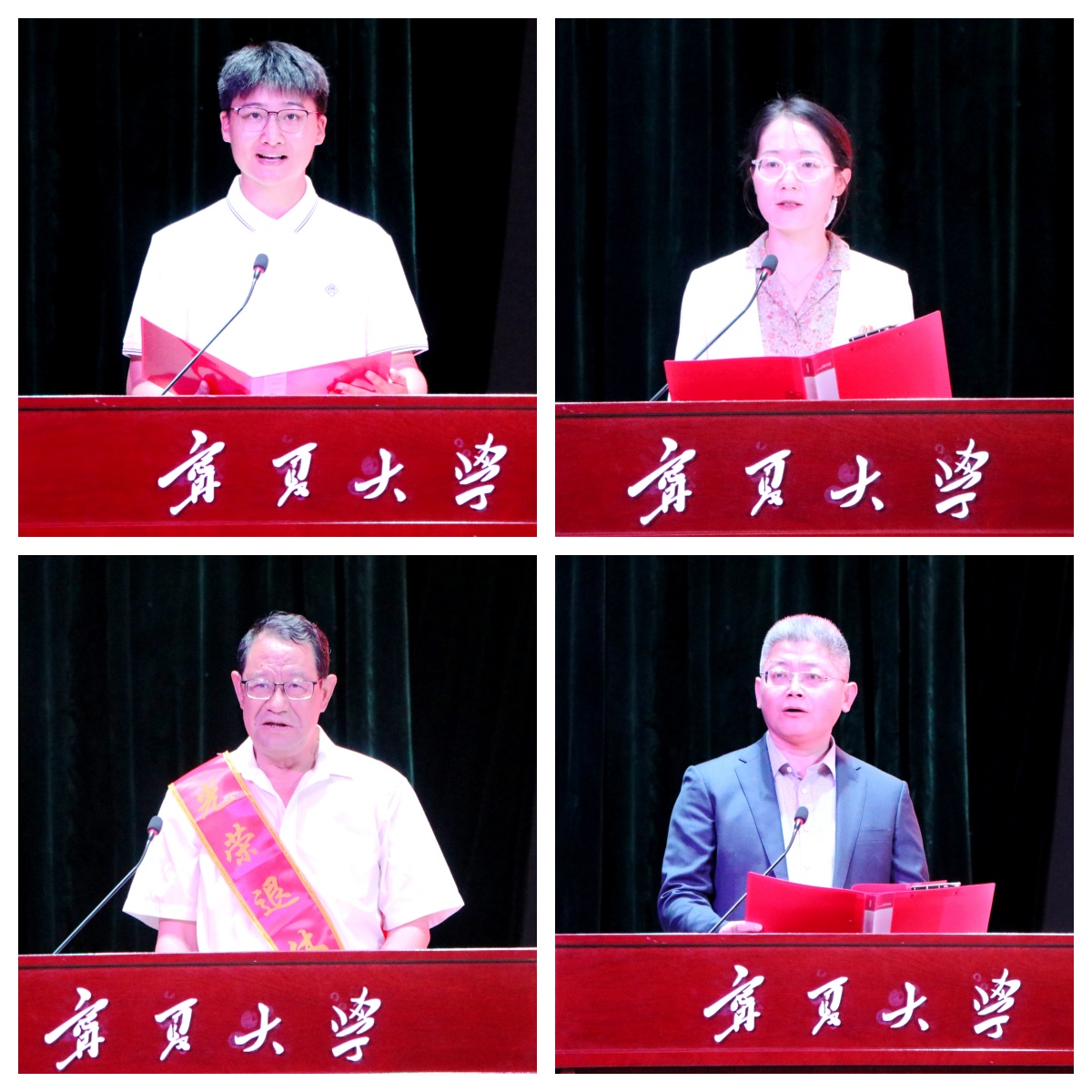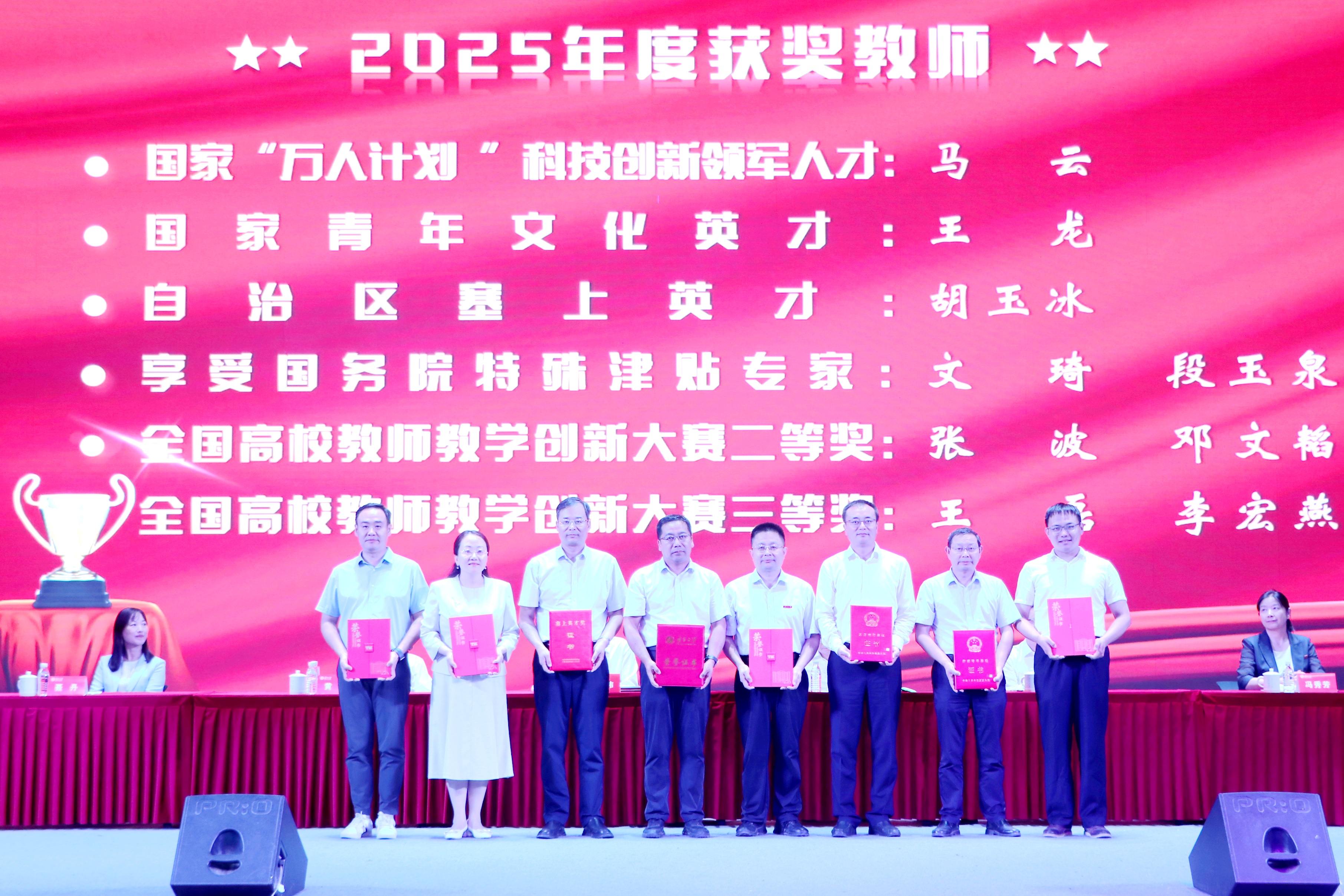 颁奖仪式上,与会领导先后为新入选国家重大人才工程者颁发聘书,为荣休教师代表颁发纪念牌,为从教满35年教师代表颁发荣誉证书和纪念牌,并为本年度享受国务院特贴的专家、入选国家“万人计划”“文化英才”的骨干、自治区“塞上英才”、全国高校教师教学创新大赛中斩获佳绩的优秀教师以及入围第四批“全国高校黄大年式教师团队”代表颁奖。