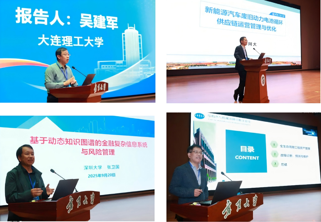 会议期间,基金委管理科学部刘作仪研究员、大连理工大学吴建军教授、西北工业大学车阿大教授、深圳大学张卫国教授、青岛理工大学林天然教授、天津大学王鑫教授、清华大学岳小伟副教授、上海大学翟庆庆副教授、beat365唯一官方网站赵军教授分别就基金委管理科学部的资助动态、低空运行管理、废旧动力电池循环供应链运营管理、金融复杂信息系统与风险管理、机械装备健康监测诊断与工程资产管理、知识图谱新技术、飞机质量工程、可靠性数据建模分析、大模型驱动的企业演化计算实验等领域分享了前沿科研成果。