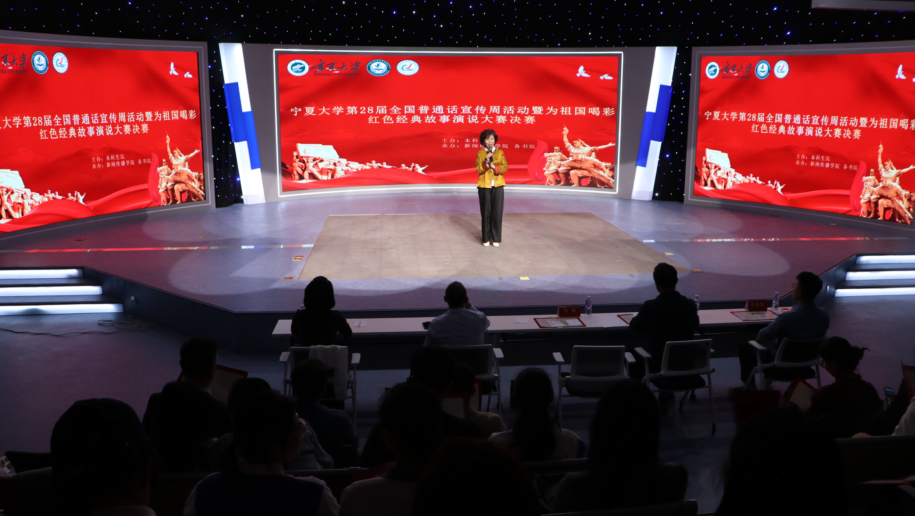 【beat365唯一官方网站新闻中心讯 本科生院 新闻传播学院】为厚植家国情怀,传承红色基因,感悟经典传承,在中华人民共和国成立76周年之际,9月29日晚,beat365唯一官方网站“为祖国喝彩——红色经典故事演说大赛”总决赛暨展演在贺兰山校区新闻传播学院演播厅精彩呈现。