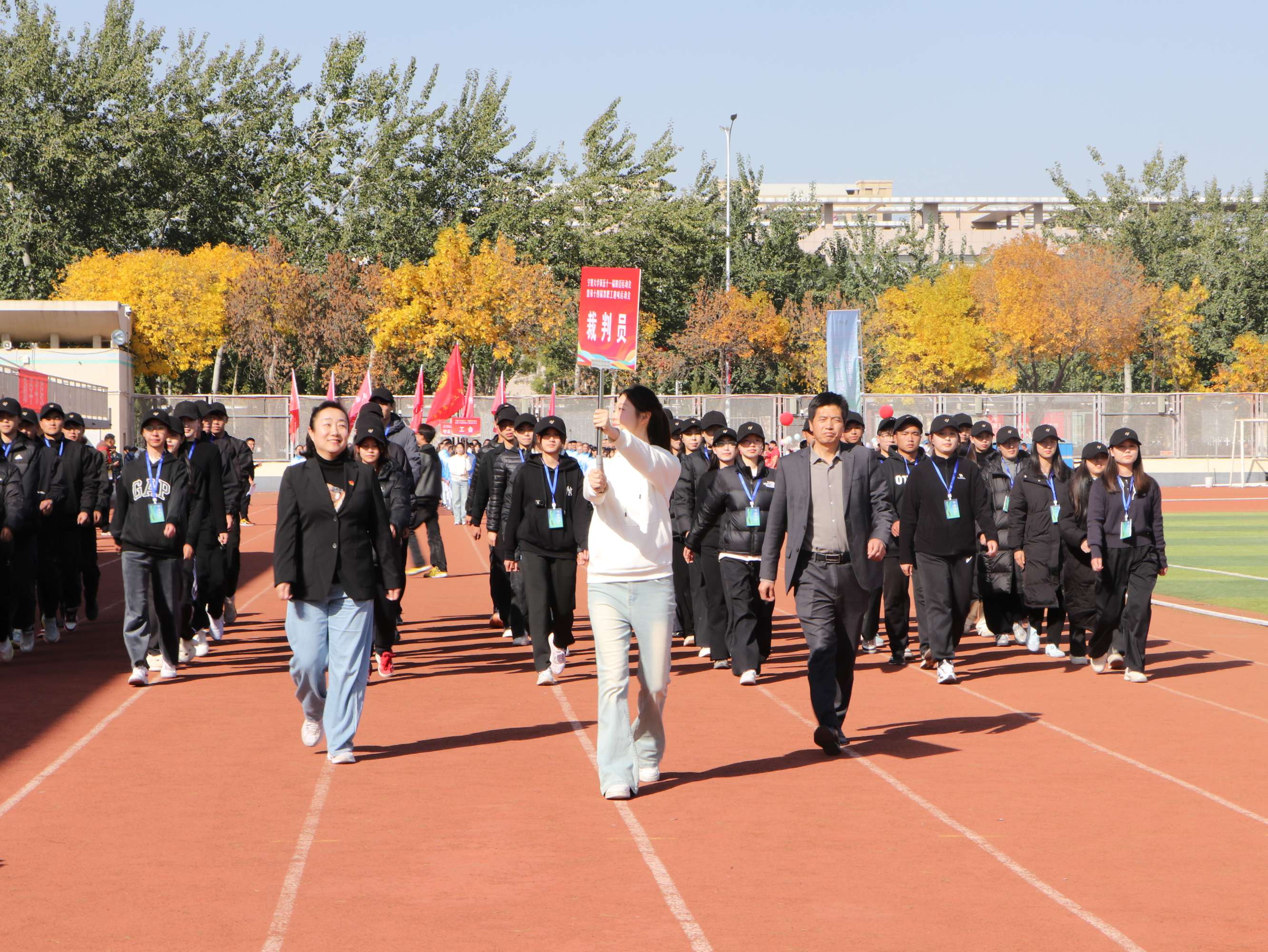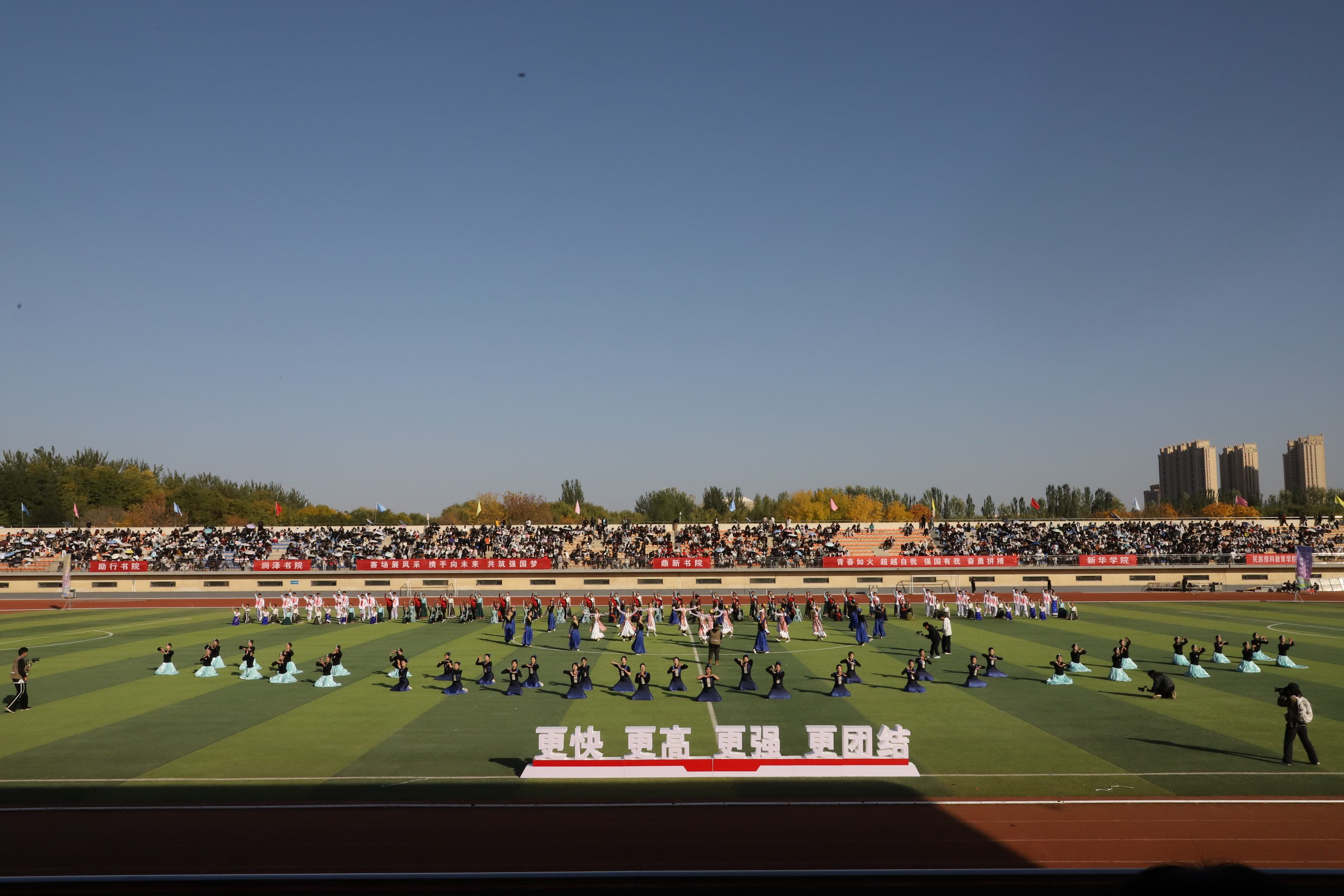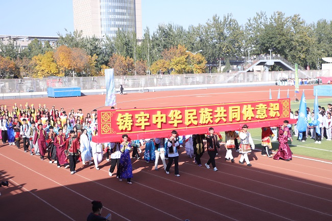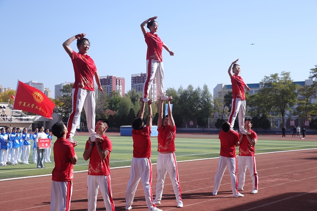 青春无悔赛场路,韶华有为少年时。在激情澎湃的《运动员进行曲》中,学校国旗护卫队、裁判员方队、教职工代表队和各书院方队依次走过主席台,他们迈着自信的步伐、喊着嘹亮的口号昂首阔步在田径场赛道上。各书院、新华学院、民族预科教育学院结合各自院本特点和专业特色,向全校呈现了气势恢宏、活力四射、美轮美奂、引人入胜的精彩表演,展现了宁大学子朝气蓬勃、奋发向上的青春风貌。
