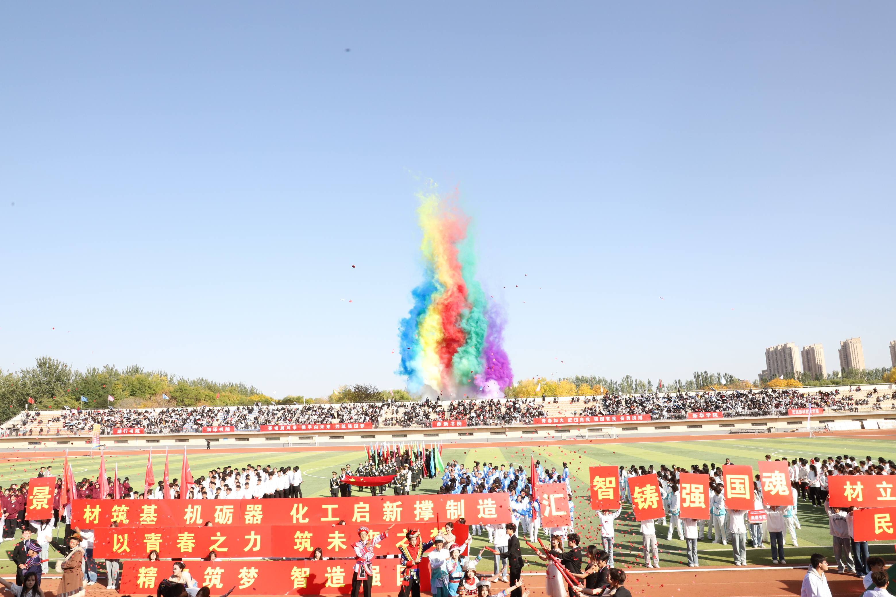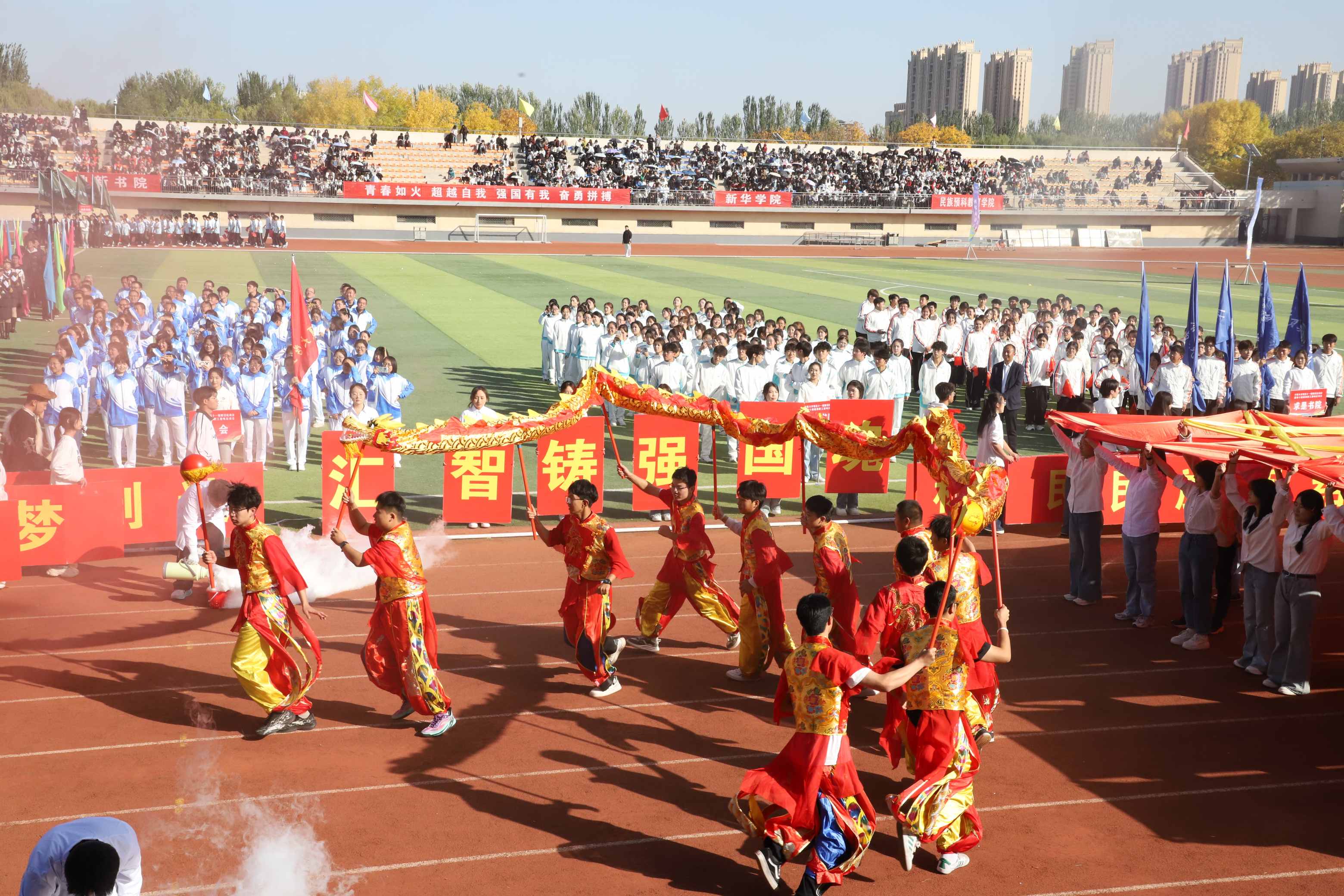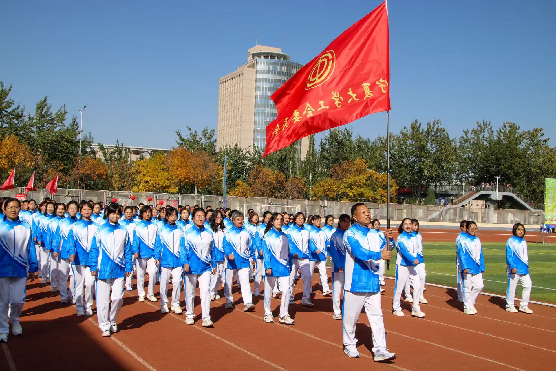 青春无悔赛场路,韶华有为少年时。在激情澎湃的《运动员进行曲》中,学校国旗护卫队、裁判员方队、教职工代表队和各书院方队依次走过主席台,他们迈着自信的步伐、喊着嘹亮的口号昂首阔步在田径场赛道上。各书院、新华学院、民族预科教育学院结合各自院本特点和专业特色,向全校呈现了气势恢宏、活力四射、美轮美奂、引人入胜的精彩表演,展现了宁大学子朝气蓬勃、奋发向上的青春风貌。