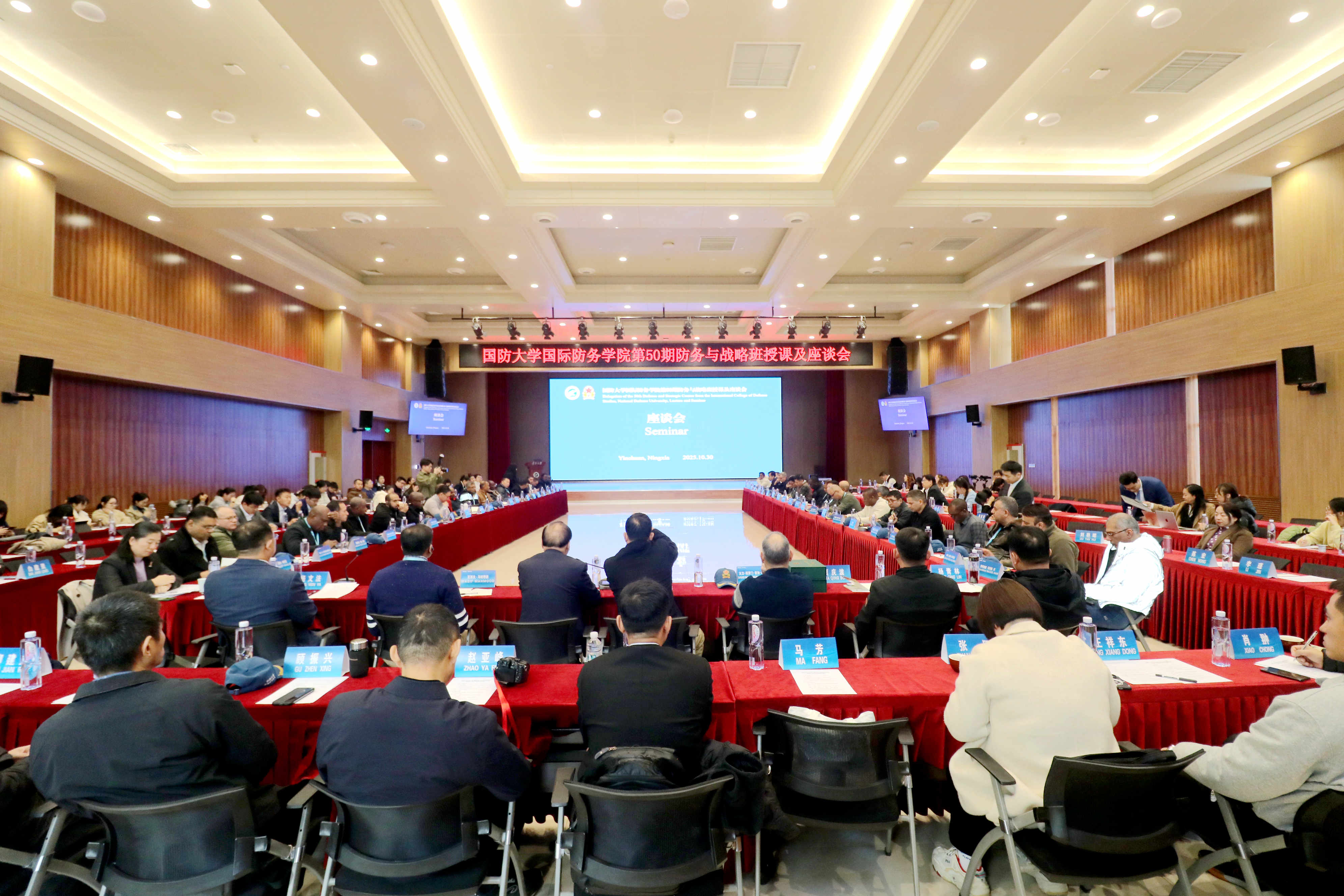 会前,国防大学国际防务学院第50期防务与战略班学员在笃行楼一楼参观了“石榴花开润塞上——铸牢中华民族共同体意识的宁夏实践”图片展览,工作人员通过英语交替传译的方式,向学员们生动讲解中华民族多元一体格局的形成与发展,帮助他们深入了解中华民族共同体建设的丰富内涵与实践成果。