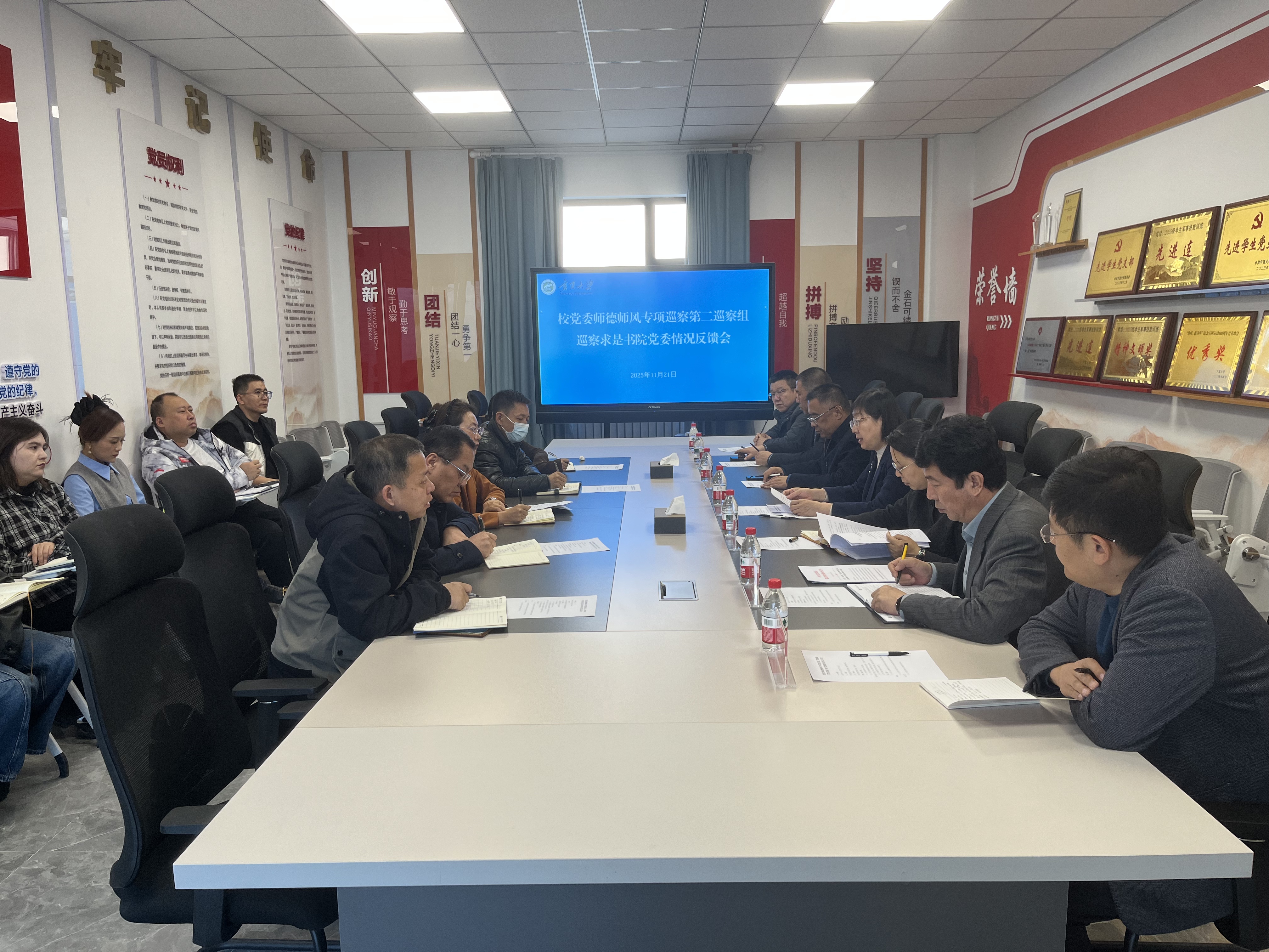 【beat365唯一官方网站新闻中心讯 党委巡察(督查)办公室】根据学校党委统一部署,2025年师德师风专项巡察反馈工作于11月21日全部完成。两个巡察组分别向勤学书院党委、求是书院党委、法学院党总支等6个被巡察党组织“一对一”反馈了巡察情况,校领导韩惠丽、黄河、马元出席反馈会。