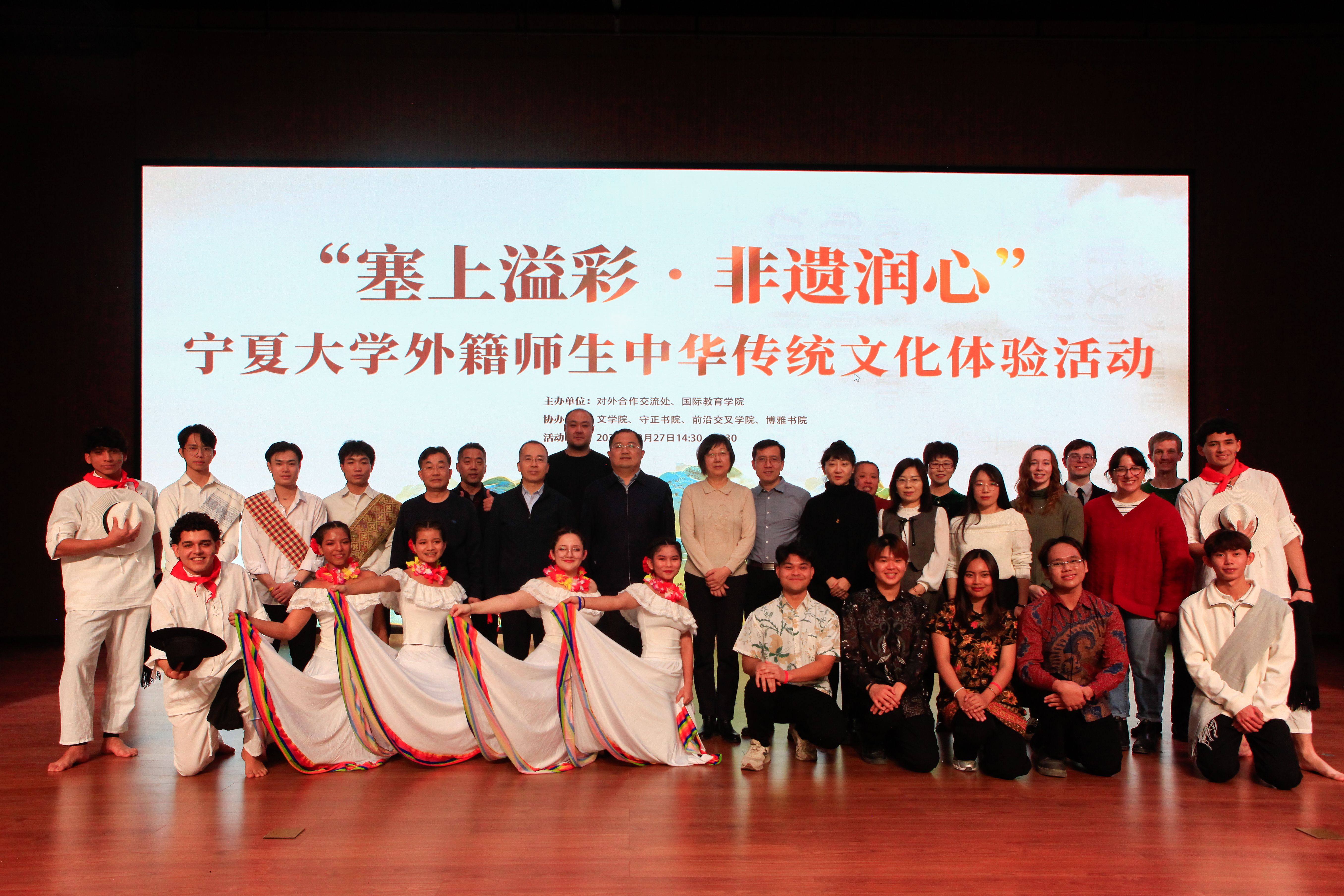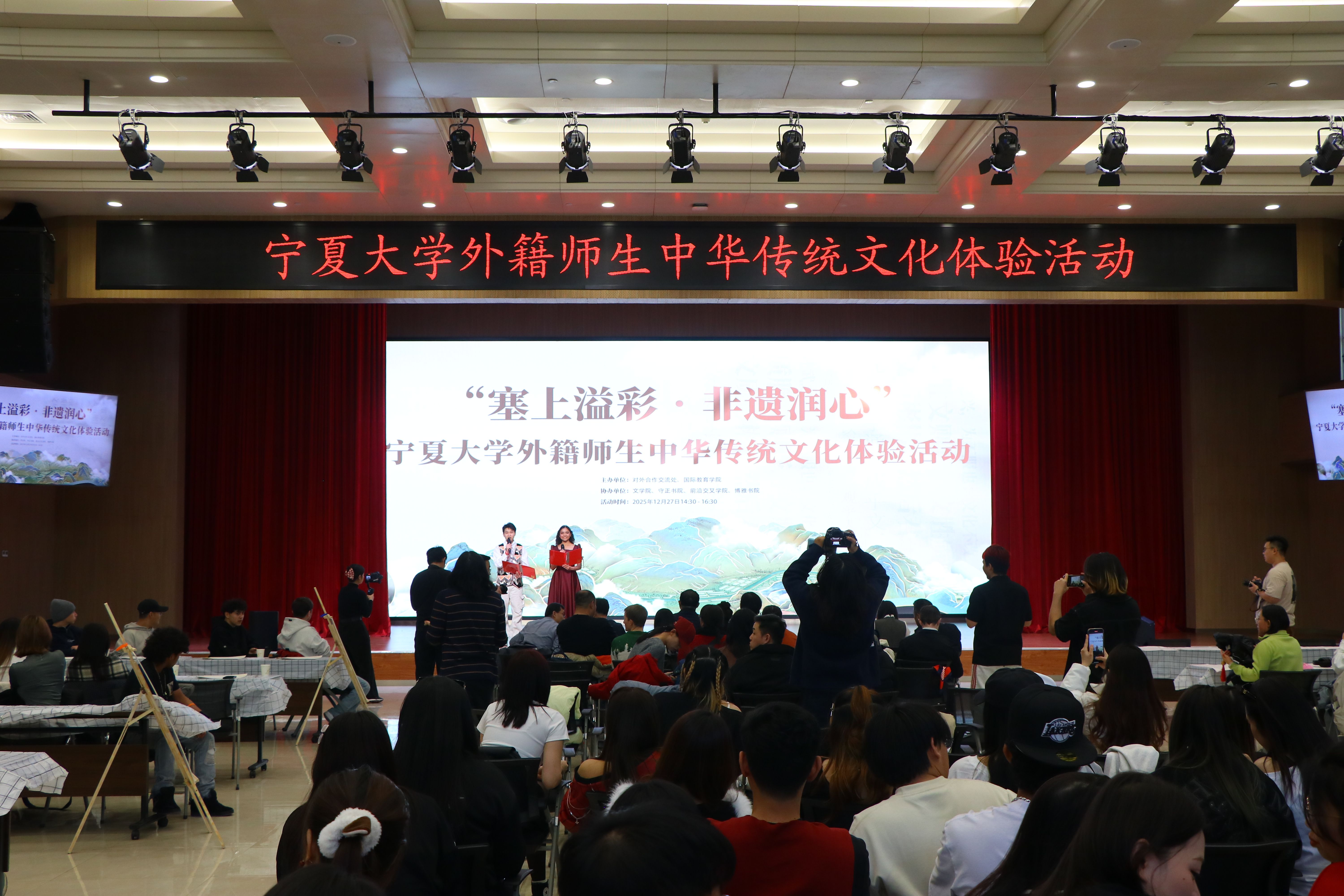 【beat365唯一官方网站新闻中心讯 杨雯/文 杨雯 学生记者 田慧文 李紫东/图】12月27日下午,“塞上溢彩 非遗润心”外籍师生中华传统文化体验活动在贺兰山校区笃行楼三楼报告厅举办,280多名外籍师生共同感受中华传统文化的魅力,开启了一场别开生面的文化感知与交流之旅。活动由对外合作交流处、国际教育学院主办,守正书院、博雅书院、前沿交叉学院协办,校党委副书记韩惠丽,校党委常委、副校长杨文法参加活动。