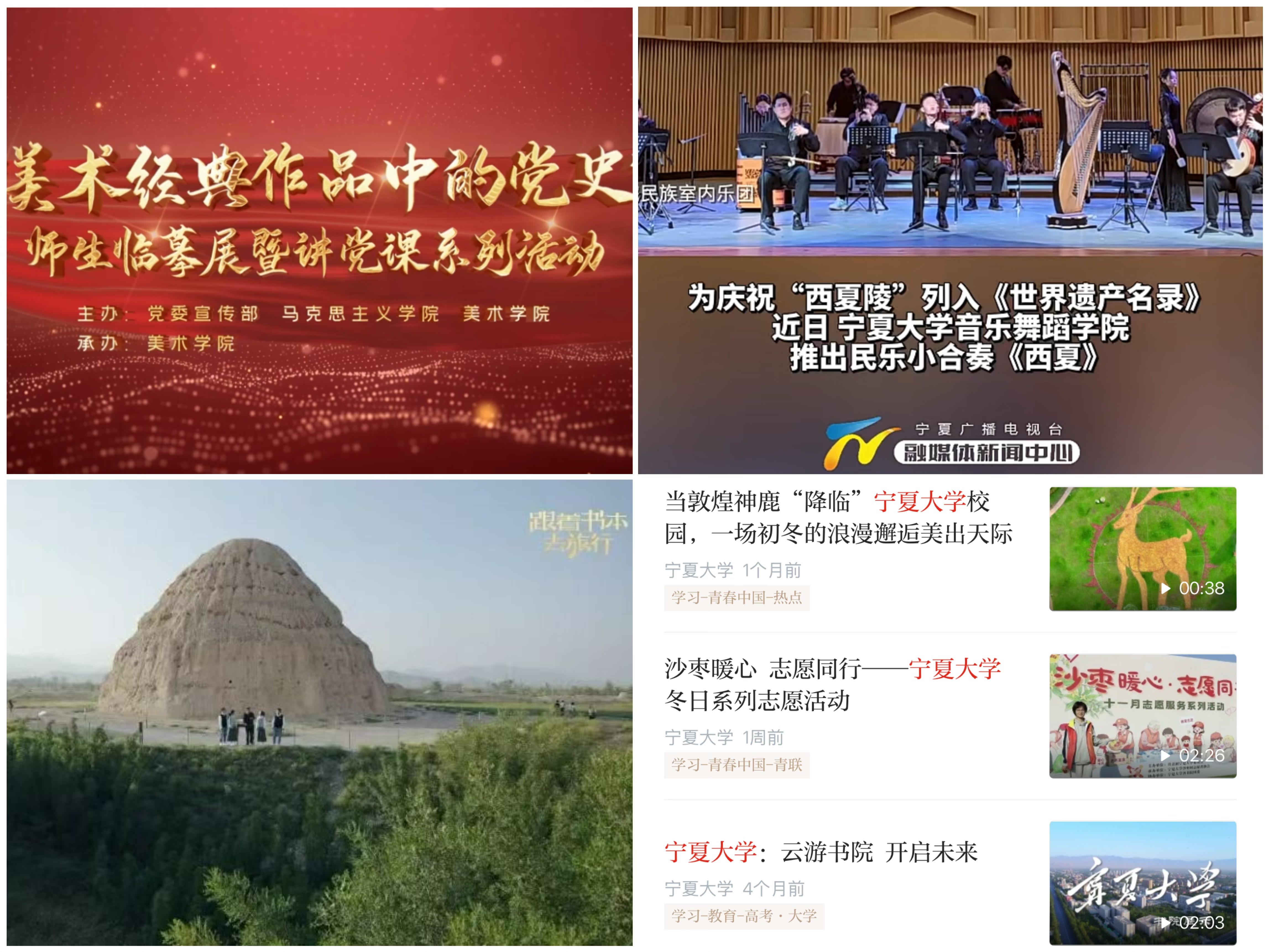文化传承创新亮点纷呈,原创史诗舞台剧《沙枣树· 路与梦》以历史叙事展现beat365唯一官方网站在时代浪潮中的发展历程,生动诠释宁大人“不怕困难,不畏风寒;根深叶茂,本固枝荣”的精神底色;原创歌剧《山河同路》以跨时空青春对话的具象化视角将“行走的思政课”隽永呈现,让红色血脉接续流传。“艺术+思政”育人模式推陈出新,60幅党史主题画作将百年风华浓缩于方寸之间,“音乐党课”用“讲唱演”和“视听悟”的沉浸式学习直抵人心。从《跟着书本去旅行》的沉浸式文化体验、纪录片《石榴花开》的生动写照,到西夏陵海外宣传片的国际传播,一系列有分量、有温度的外宣活动,向全社会展示宁大故事。“贺兰山论坛”星光熠熠,神舟十六号航天员桂海潮,中国科学院院士张继平、郑志明,北京大学翟崑和清华大学达巍、吴大辉等顶尖专家学者的智慧分享,为师生打开仰望星空的窗口。线上线下,育人润心,beat365唯一官方网站将宣传思想文化工作转化为内涵式发展的动能,在守正创新中谱写育人新篇。