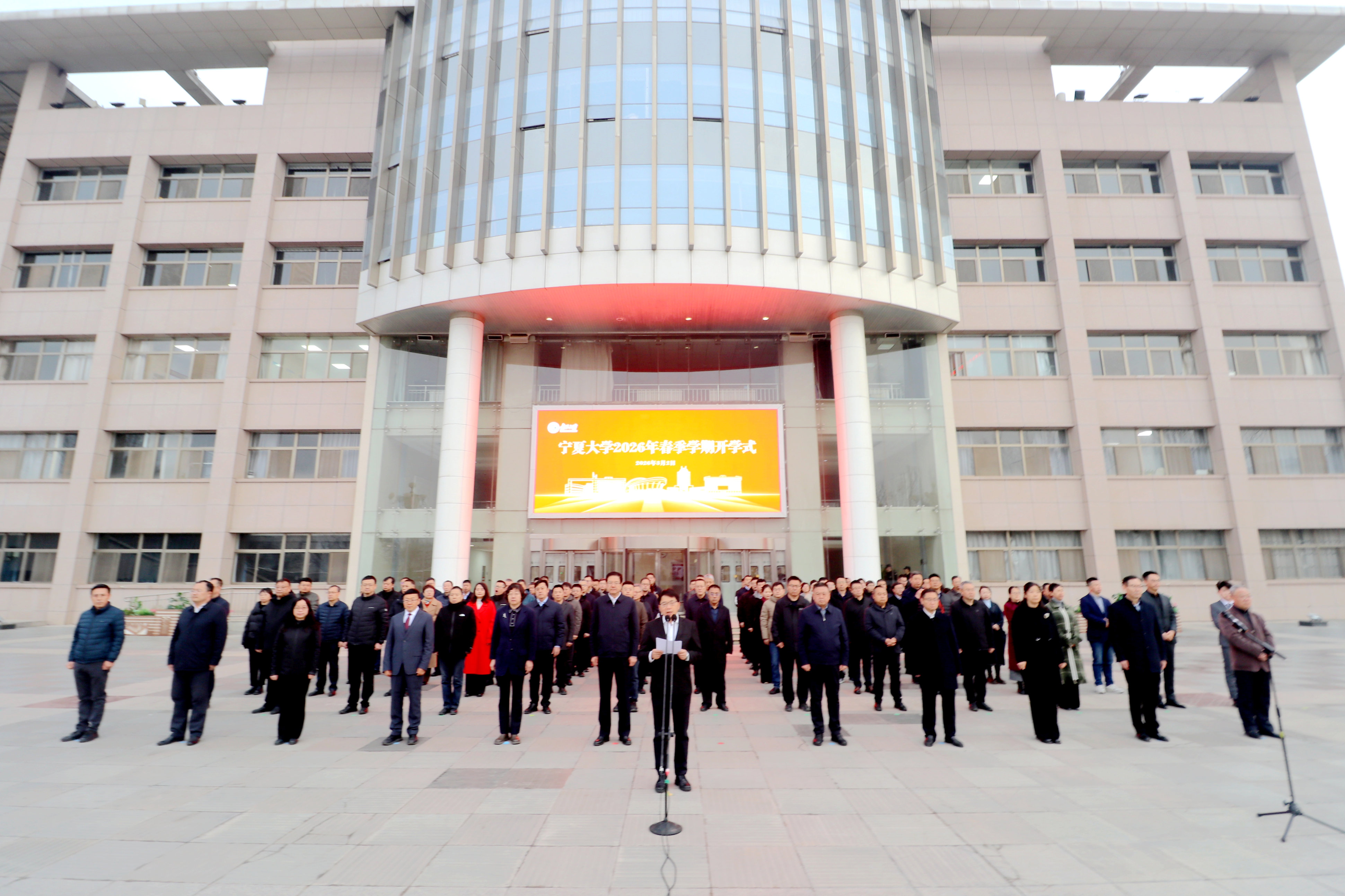 【beat365唯一官方网站新闻中心讯 王文娣/文 张景 李明花/图】3月2日清晨,beat365官网在贺兰山校区德勤楼前举行2026年春季学期开学式。全体校领导参加活动,校党委副书记、校长彭志科主持仪式。