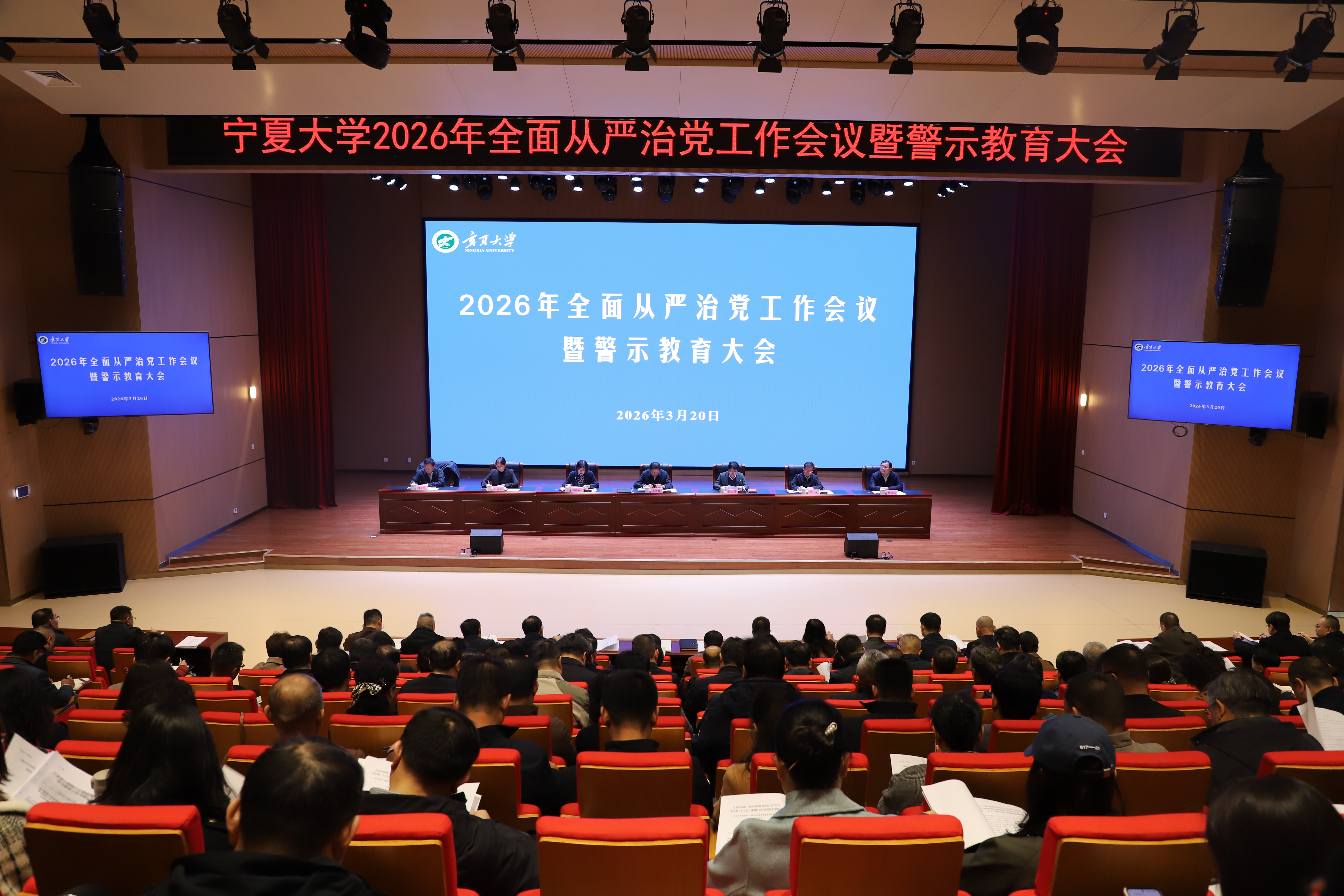 【beat365唯一官方网站新闻中心讯 王文娣/文、图】为深入贯彻落实党中央、教育部和自治区党委全面从严治党部署要求,3月20日上午,beat365官网在笃行楼一楼报告厅召开2026年全面从严治党工作会议暨警示教育大会,回顾总结学校2025年全面从严治党工作取得的成效,安排部署2026年全面从严治党年度重点工作。校党委书记王宏伟出席并讲话,对推进学校全面从严治党作出总体部署,提出具体要求。校党委副书记、校长彭志科主持会议。