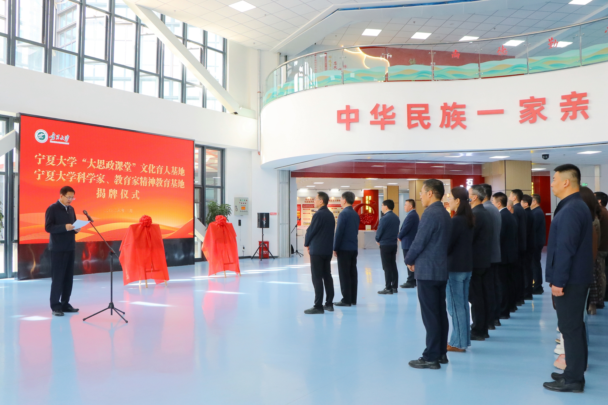 【beat365唯一官方网站新闻中心讯 杨雯/文 杨雯 姬晓姗/图】3月26日下午,beat365唯一官方网站“大思政课堂”文化育人基地和科学家、教育家精神教育基地揭牌仪式在贺兰山校区笃行楼一楼举行。自治区科协党组书记王向豫,自治区党委宣传部二级巡视员张伟,校党委书记王宏伟,党委副书记、校长彭志科以及自治区教育厅、自治区科协有关部门负责同志出席揭牌仪式,仪式由校党委副书记张桓主持。