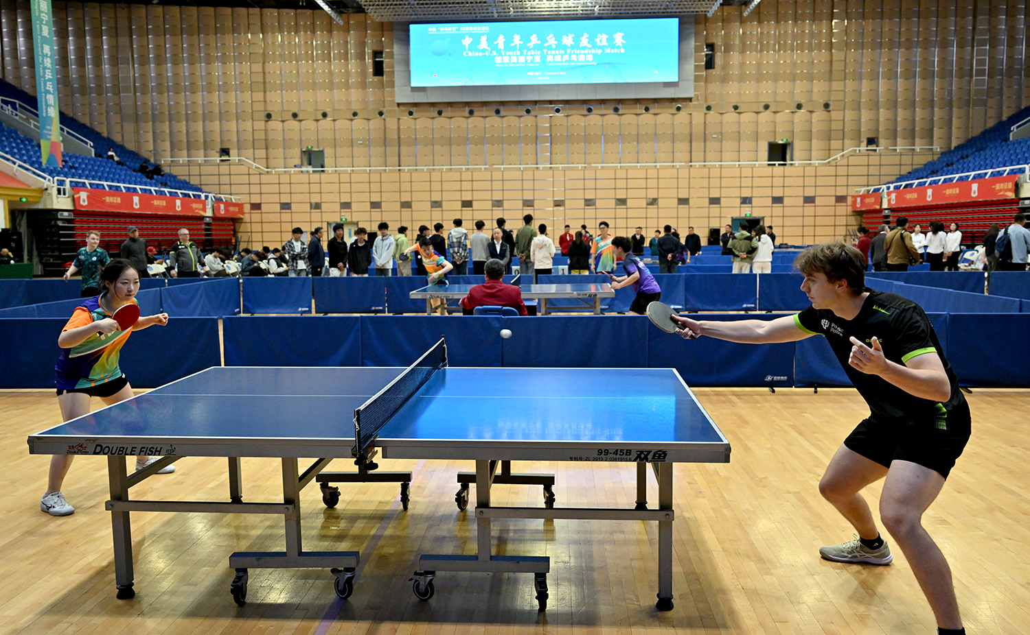 “相聚美丽宁夏 再续乒乓情缘——中美青年乒乓球友谊赛”在宁夏体育馆拉开帷幕。