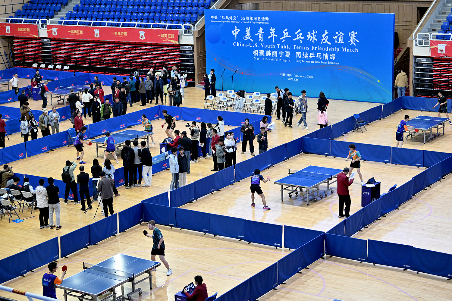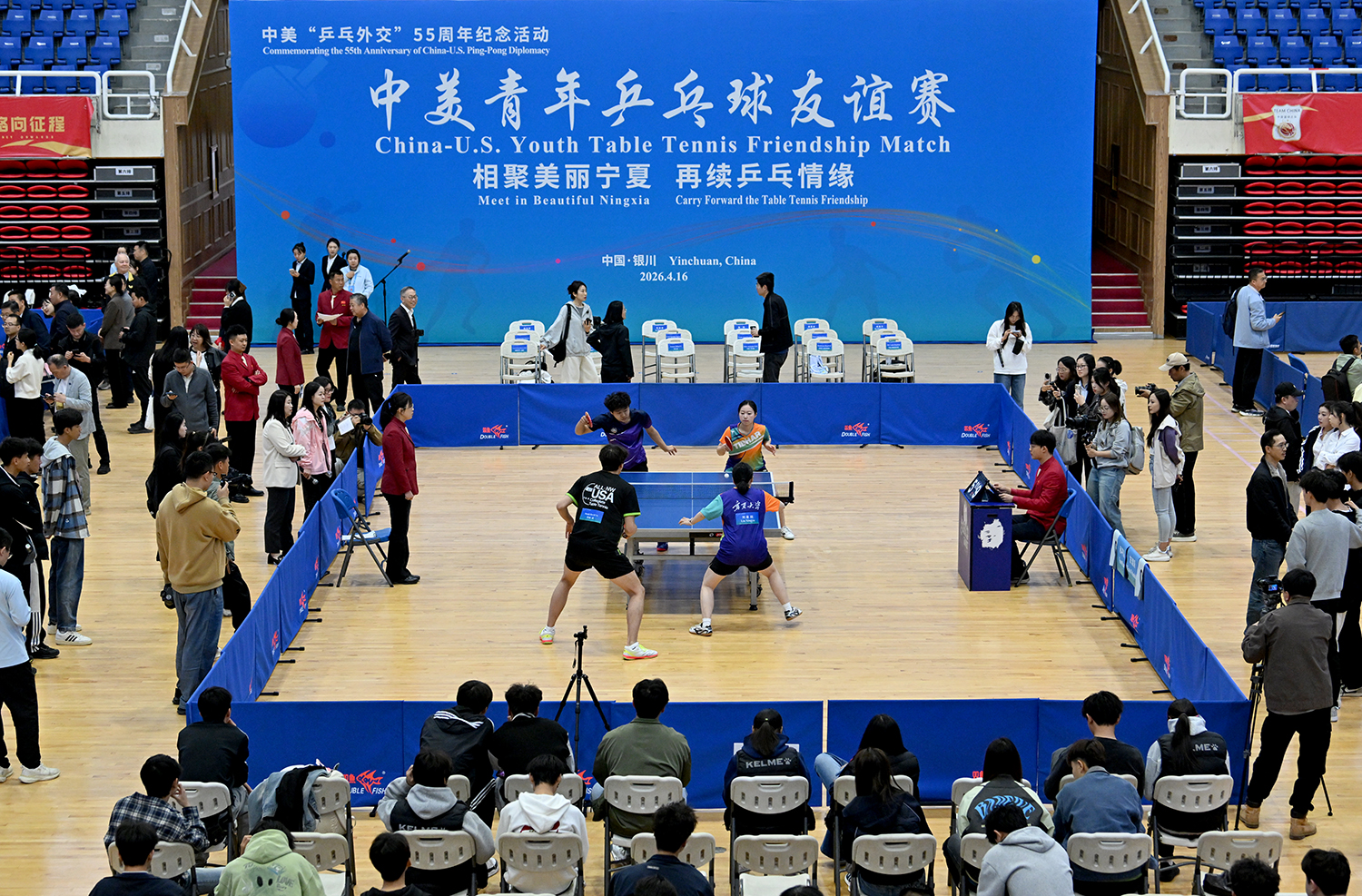 4月16日上午,为纪念中美“乒乓外交”55周年,“相聚美丽宁夏 再续乒乓情缘——中美青年乒乓球友谊赛”在宁夏体育馆拉开帷幕。