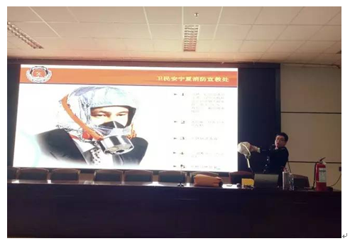 讲座中,银川市卫民安消防宣教处张瑛教官从“消防安全四个能力”入手,依次从消防安全基础知识,火场逃生、自救知识以及消防器材使用、检查和维护三个方面对参会者进行了培训。随后,他通过大量真实案例,配合一幅幅触目惊心的图片、一段段发人深省的视频,生动讲解了消防安全知识。张瑛还介绍了常规消防设施的使用,并现场演示了灭火器、防火面具的正确使用方法,让大家对消防知识有了更直观的了解。在互动环节,张瑛教官以“家里突发火灾如何应对”为题与观众进行互动交流,用幽默风趣的语言讲解了火灾逃生的技巧与方法。在零距离的互动中,大家加深了对消防安全的重视程度,增进了对消防工作的更深层次认识。
