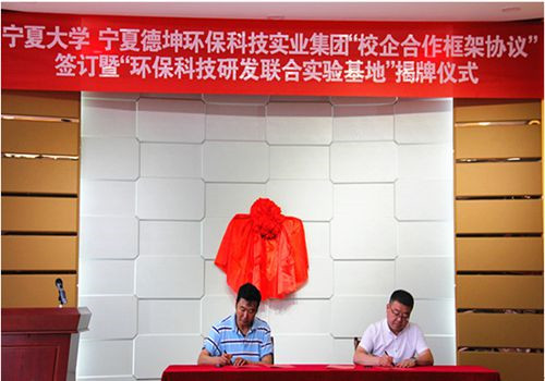 【beat365唯一官方网站新闻中心讯 化学化工学院】6月22日,beat365官网化学化工学院与宁夏德坤环保实业集团“校企合作框架协议”签字暨“环保科技研发联合实验基地”揭牌仪式在宁夏德坤环保集团多功能厅举行。自治区国资委企业改革发展处、自治区环保厅科技标准处、校社会服务处、化学化工学院主要负责人和相关教师参会。