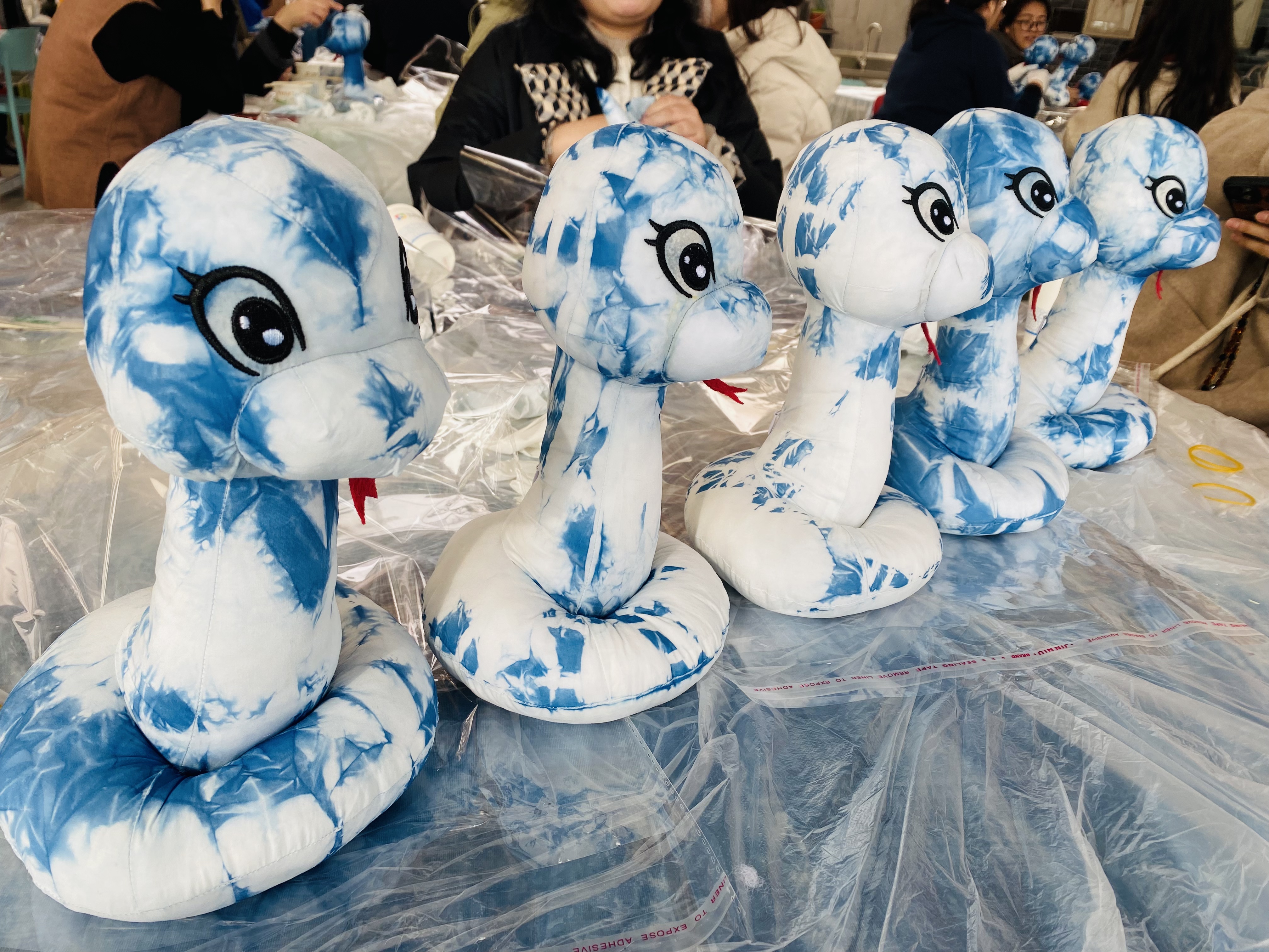 本次活动巧妙融合非遗文化与生肖元素,在非遗传承人鱼颖老师的带领下,大家了系统学习了扎染技艺的千年传承脉络。通过捆扎、浸染、固色等传统工序,一个个活灵活现各有特色的生肖蛇布偶呈现在大家眼前。