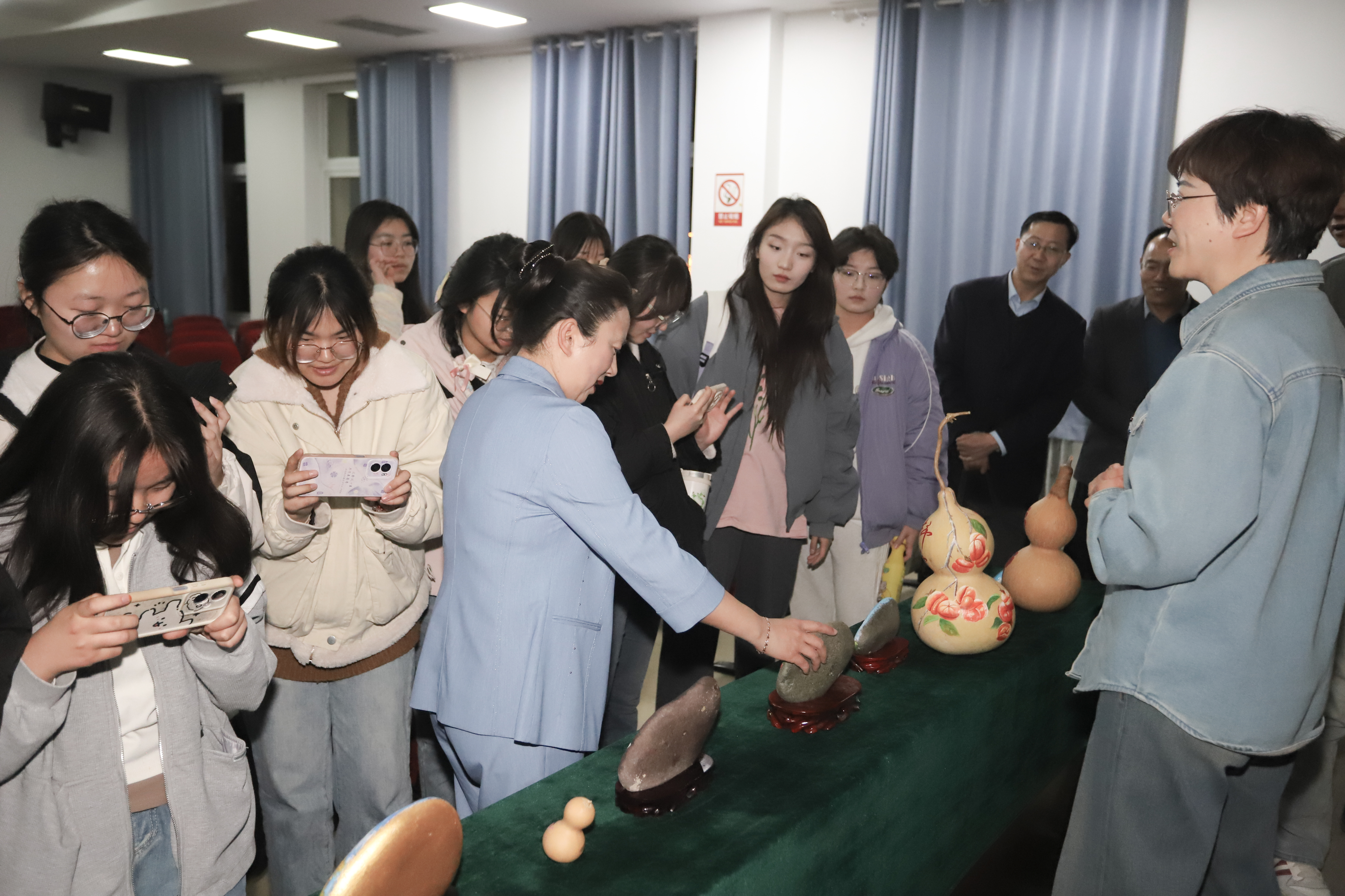 讲座结束,腊春红为在场师生讲解自己创作的石头绘画作品。