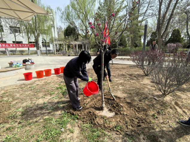 在校园管理服务中心绿化人员的示范指导下,全体党员热情高涨,干劲十足,大家分工明确,配合默契,携手挥锹铲土、扶苗培根、填坑灌溉,植树现场呈现出一片热火朝天的劳动景象。丁香、海棠、木槿等树木牢牢扎根于怀远校区物理学院东侧游园,在春风中傲然挺立、错落有致,为初春的校园增添了一抹新绿。