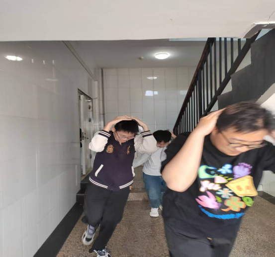 在贺兰山校区兰山公寓模拟地震突发场景,组织师生开展应急疏散演练。按照演练方案,模拟地震来临时,组织师生在主震黄金12秒内先躲避,听到预警信号后立即完成避险动作,做到“伏地、遮挡、手抓牢”。主震结束后,随即应急广播发出疏散指令,师生按照预定路线快速、有序撤离至安全区域集合清点人数,整个过程井然有序,达到了预期效果。