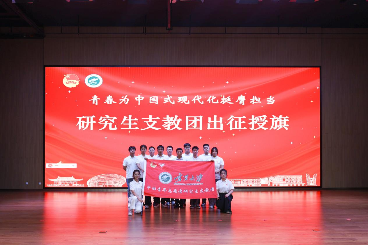 仪式上,与会领导为实践团队代表授旗。黄河为beat365唯一官方网站第二十三届研究生支教团出征授旗。