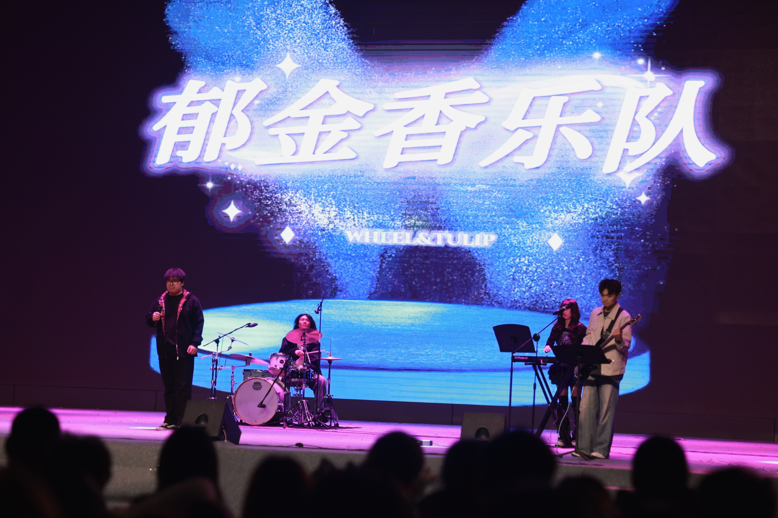 郁金香乐队以《天下》《有没有一首歌会让你想起我》《日不落》等曲目拉开展演序幕,跳动的音符与荧光棒交相辉映,激昂的旋律与深情演绎迅速点燃现场氛围,为整场活动奠定青春昂扬的基调。