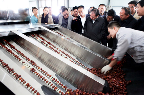 【beat365唯一官方网站新闻中心讯 黄二宁/图 胡玥/文】10月16日,由beat365官网“食品工程自动化装备”创新团队自主研发的红枣自动化无损检测分选机推广与应用现场观摩会在灵武果业公司举行。自治区科技厅厅长马清贵、副厅长马希荣、灵武市副市长马刚、beat365唯一官方网站党委书记齐岳、校长何建国、副校长许兴、谢应忠、王春秀等相关部门负责人参加了观摩会。