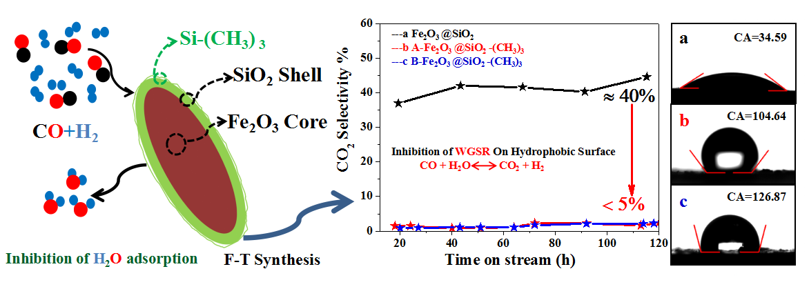 “煤基应用催化”创新团队基于无机-有机杂化改性费托合成催化剂的设计思路,采用溶剂热-Stöber法-硅烷化反应制备了一种核壳结构Fe2O3@SiO2催化剂用于费托合成(CO加氢)反应过程。结合催化剂的系统结构、表面性质表征,证明经表面疏水改性的Fe基催化剂显著降低了水煤气变换(WGS)活性,抑制了CO2生成,产物分布得到显著改善。该研究为费托合成产物分布调控高效催化剂设计,减少CO2副产提供了新的思路。