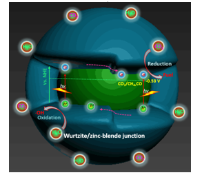 CO2是有机物燃烧的最终产物,所以其到有机燃料的逆转化无疑具有极大的热力学障碍。以最具吸引力的CO2和H2O合成甲烷和氧气的反应为例,其ΔG高达889.6 kJˑmol-1。而模拟植物光合作用的人工光合成是CO2转化和利用的创新技术,它利用太阳能激发半导体光催化材料产生光生电子-空穴,以诱发氧化-还原反应将CO2和H2O反应合成碳基燃料。最近,课题组通过调控合成液的pH值并结合水热合成参数控制,诱使hexagonal wurtzite CdS原位向cubic zinc-blende CdS定向转化,成功制得了具有异相结构可调的wurtzite/zinc-blende CdS复合光催化剂。通过TEOA用量和水热时间的调变及优化,系统研究了不同异相结构的CdS复合光催化剂可见光催化转化CO2与H2O制碳基燃料的催化性能;同时发现“结”的存在能够有效缓解CdS光催化剂的光腐蚀,继而在连续反应100 h其可见光光催化还原CO2活性几乎不发生衰减。