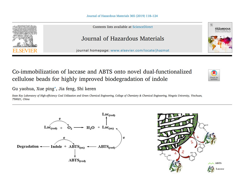 相关研究成果“Co-immobilization of laccase and ABTS onto novel dual-functionalized cellulose beads for highly improved biodegradation of indole”近期在线发表于Journal of Hazardous Materials杂志(IF:6.434)。研究受到国家自然科学基金和自治区科技支撑计划项目等资助。