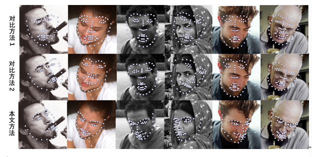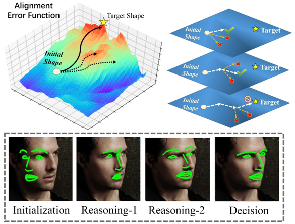 该研究成果主要创新点在于将人脸关键点检测建模为马尔科夫决策过程,通过采用梯度策略算法全局优化人脸形状更新梯度和形状评价函数,使得累计形状奖励值最大的同时形状更新梯度最优。该工作首次利用深度强化学习框架获得具有马尔科夫决策收敛性质的人脸形状搜索策略。并且在算法中采用K-近邻形状搜索约束,在形状预测阶段算法能够自主评价预测结果并选择合理形状搜索路径。本方法有效解决传统级联回归方法对于初始化过度依赖和敏感问题,进而有效提升人脸关键点检测在无约束环境下的鲁棒性。