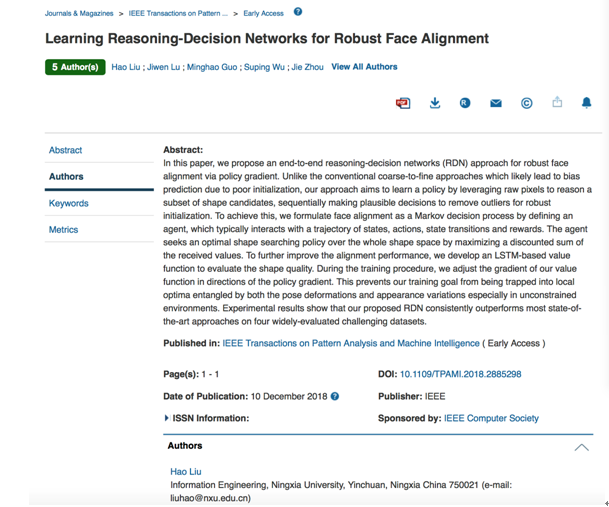 【beat365唯一官方网站新闻中心讯 信息工程学院】近日,信息工程学院教师刘昊博士在精准人脸关键点检测与提取方面取得重要进展,其论文Learning Reasoning-Decision Networks for Robust Face Alignment(基于推断决策网络的鲁棒人脸对齐)被人工智能和模式识别领域国际顶级期刊IEEE Transactions on Pattern Analysis and Machine Intelligence(简称PAMI)接收发表,DOI:https://doi.org/10.1109/TPAMI.2018.2885298.该期刊同时被SCI和EI检索,中科院JCR一区(TOP期刊),中国计算机学会CCF A类期刊,2018年影响因子9.455,也是beat365官网在该信息领域影响因子发表最高的论文之一。