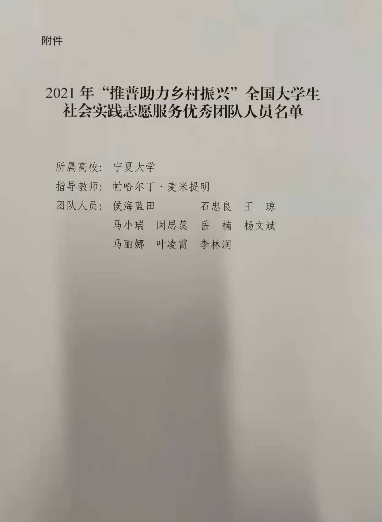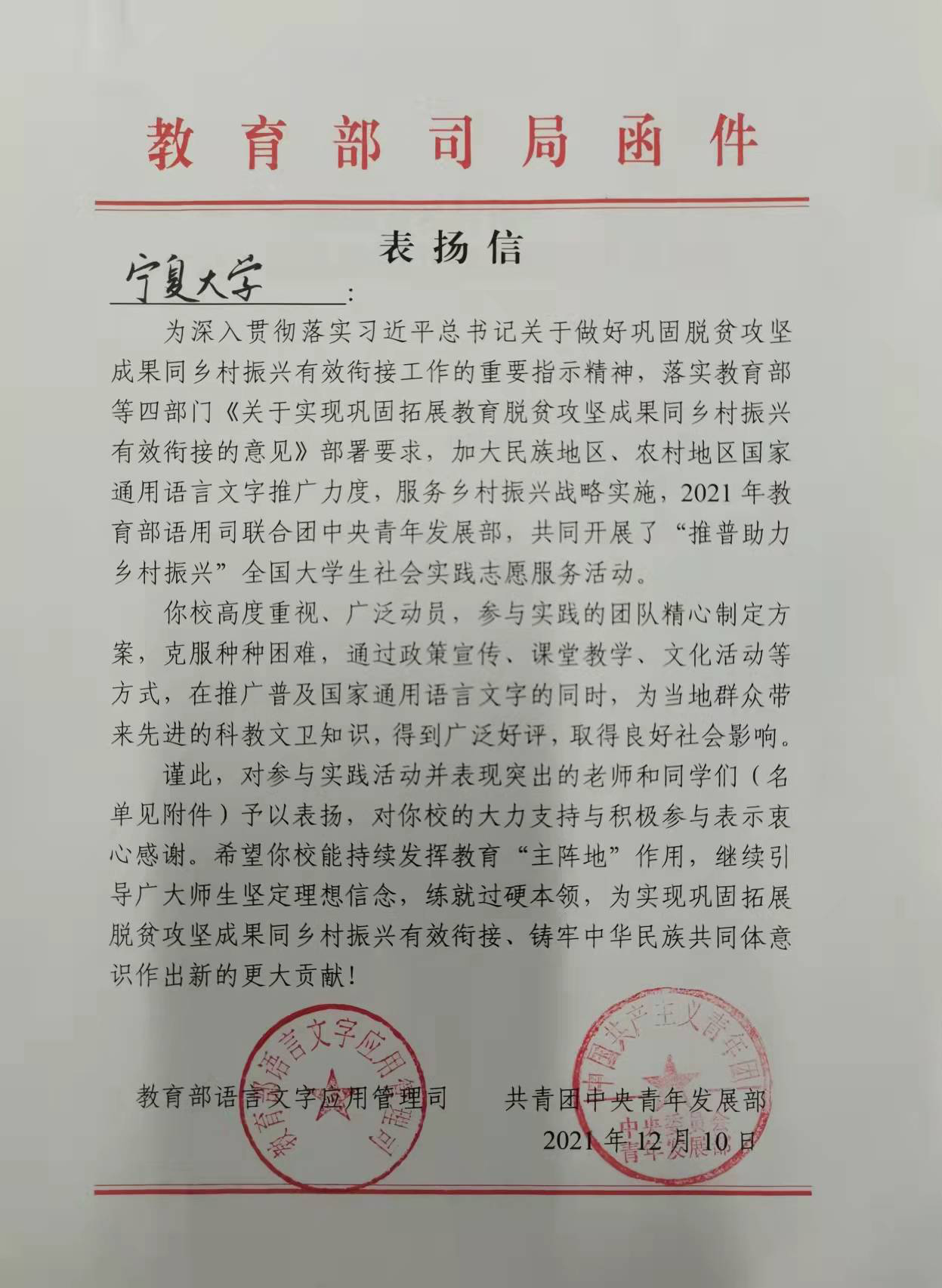 【beat365唯一官方网站新闻中心讯 校团委】近日,共青团中央青年发展部、教育部语言文字应用管理司向beat365官网发来表扬信,感谢beat365唯一官方网站对2021年“推普助力乡村振兴”全国大学生社会实践志愿服务活动的大力支持,高度肯定了beat365官网暑期社会实践团队——生命科学学院新疆推普实践团在社会实践中的工作表现,并将其评选为全国大学生社会实践志愿服务优秀团队。