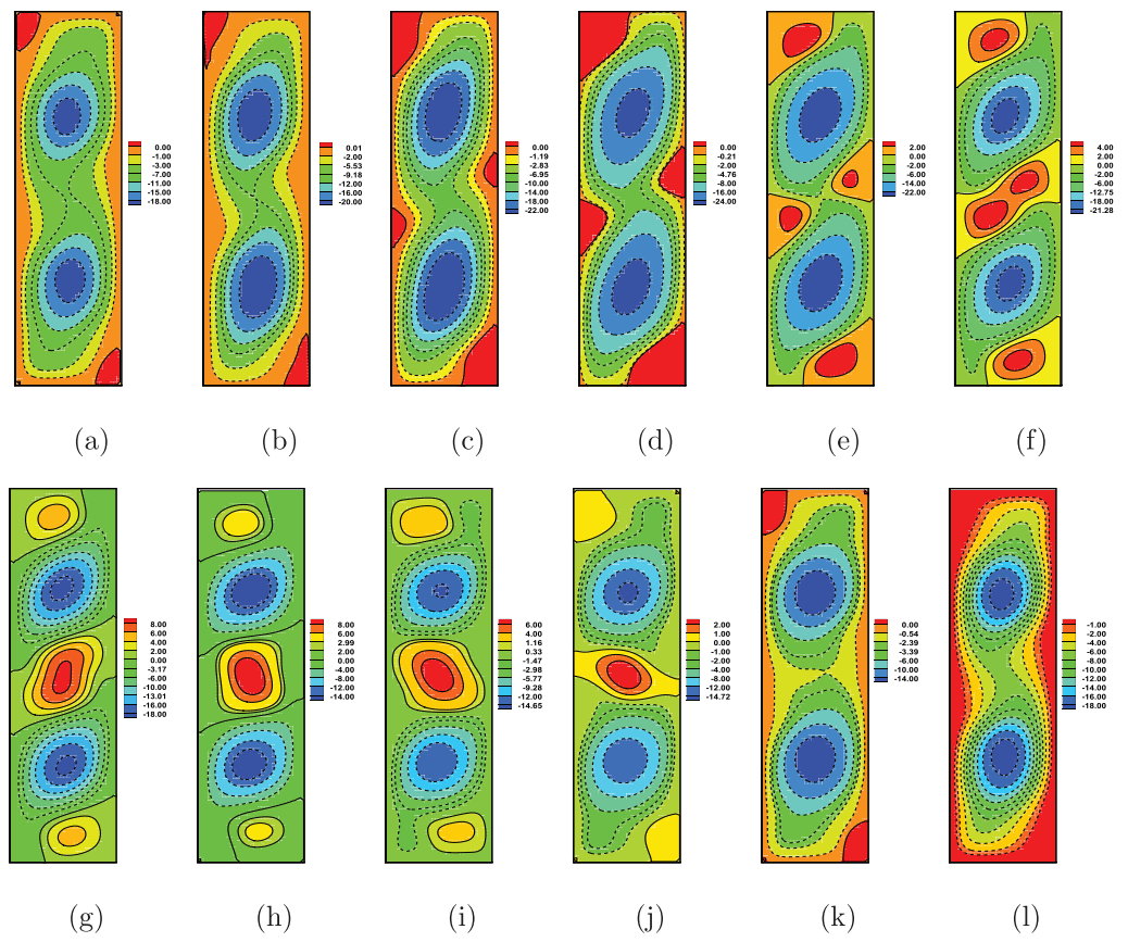 Fig.4 Time history of streamline contours for N=0.98. (a)–(l) show12averaged distributions of time nodes in a complete period (dimensionless time interval isΔT=0.05572). Solid lines: counterclockwise; dashed lines: clockwise