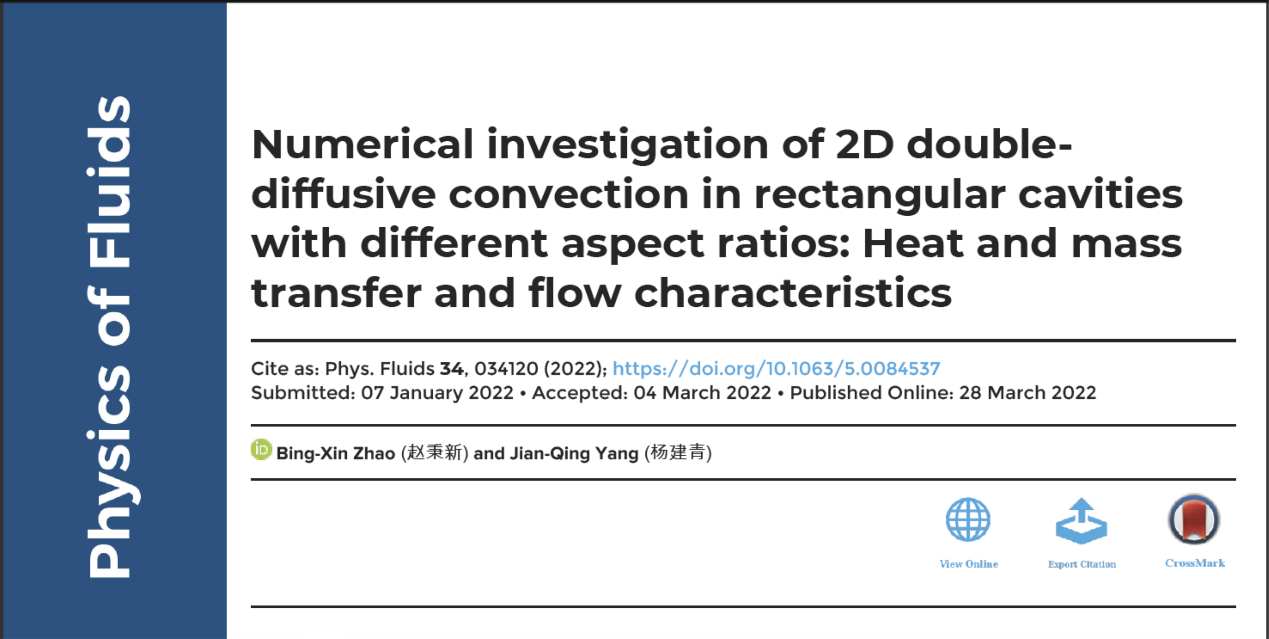 1.《Numerical investigation of 2D double-diffusive convection in rectangular cavities with different aspect ratios: Heat and mass transfer and flow characteristics》全文链接: https://doi.org/10.1063/5.0084537