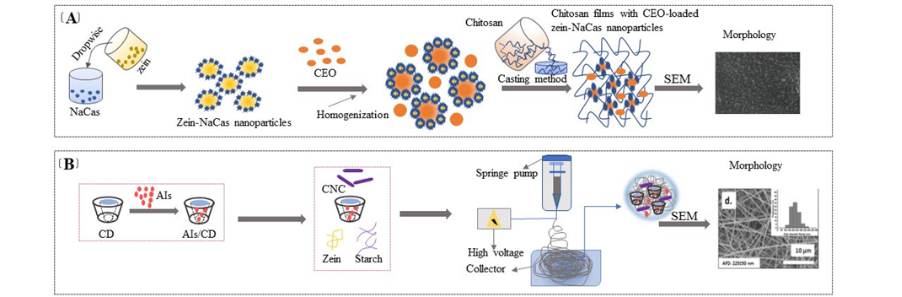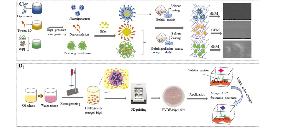 Figure1. (A) The schematic illustration of the preparation of chitosan films with CEO-loaded zein-NaCas nanoparticles (adapted fromHua et al. (2021); (B) Schematic diagram of multistimuli-responsive fiber films by electrospinning (based onAytac et al. (2021)study); (C) Flow chart of preparation of edible film based on nanoliposomes, nanemulsions and Pickering emulsions(Respectively according toWu et al. (2015) andShen et al. (2021) work). (D) A novel composite film could form by extruding the anthocyanins-encapsulated bigels onto polyvinylidene fluoride (PVDF) using 3D printing approach for monitoring the freshness of fish and meat (Zhai et al., 2022)