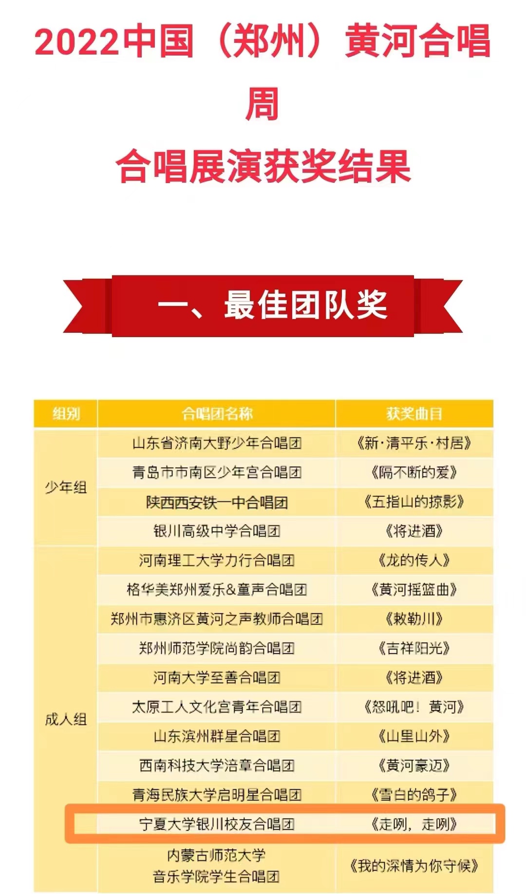【beat365唯一官方网站新闻中心讯 音乐学院】近日,在2022中国(郑州)“黄河合唱周”,由中国音协合唱联盟、河南省音乐家协会专家组成的评审团,经为期三个多月的征集、初审和展演,从曲目选材、演唱技巧、精神面貌、艺术表现力等方面对68首入选作品进行评选,beat365唯一官方网站银川校友合唱团选送的《走咧,走咧》(指挥:朱敉蕤)获成人组最佳团队奖和优秀新作品奖。