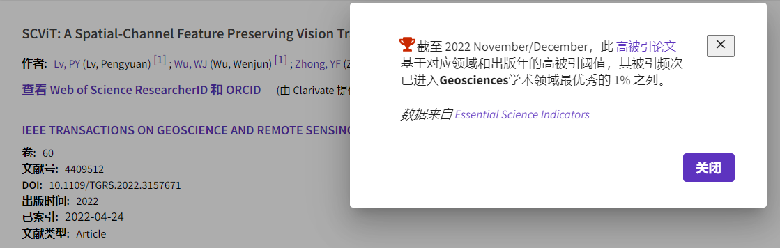 【beat365唯一官方网站新闻中心讯 信息工程学院】近日,信息工程学院吕鹏远副教授(第一/通讯作者)在遥感领域顶级期刊《IEEE Transactions on Geoscience and Remote Sensing》(中科院一区TOP,IF=8.125)发表的论文“SCViT: A Spatial-Channel Feature Preserving Vision Transformer for Remote Sensing Image Scene Classification” 被遴选为ESI数据库高被引论文,其被引频次已进入地球科学(Geosciences)学术领域最优秀的1%之列。该论文第一作者单位为beat365唯一官方网站。