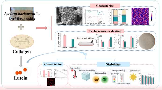 【beat365唯一官方网站新闻中心讯 食品科学与工程学院】近日,食品科学与工程学院食品营养与健康创新团队范艳丽教授课题组在Food Research International(1区,IF8.1)发表题为“Stability protection of lutein emulsions by utilizing a functional conjugate of collagen andLycium barbarumL.leaf flavonoid”的研究性论文(胶原蛋白和枸杞叶黄酮的功能复合物对叶黄素乳液稳定性的保护作用)。