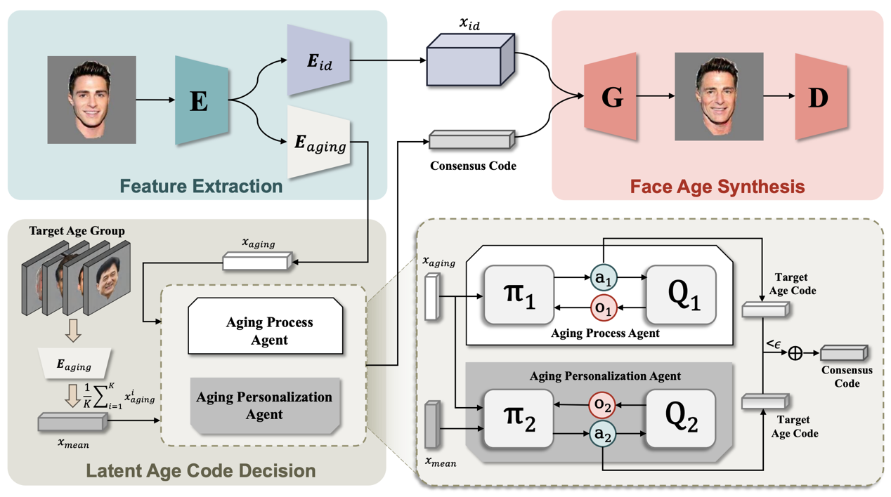 论文《Consensus-Agent Deep Reinforcement Learning for Face Aging》致力于解决人脸老化任务(模拟面部外观随时间的变化)中缺乏同一身份下不同年龄数据的问题。现有模型通常使用年龄组之间的映射来训练,这使得大多数现有的老化方法难以准确捕捉个体身份与老化特征之间的对应关系,导致生成与真实老化外观不匹配的人脸。该研究重新标注了CACD2000数据集,并提出了一种共识智能体深度强化学习方法来解决上述问题。具体来说,所提方法定义了两个智能体,即老化进程智能体和老化个性化智能体,并将匹配老化特征的任务建模为马尔可夫决策过程。老化进程智能体模拟个体的衰老过程,而老化个性化智能体则计算个体的衰老外观与平均衰老外观之间的差异。两个智能体通过协同合作的形式迭代调整目标老化特征与当前身份之间的匹配程度。在四个面部老化数据集的广泛实验结果表明,与当前最先进的方法相比,所提模型取得了令人信服的性能。