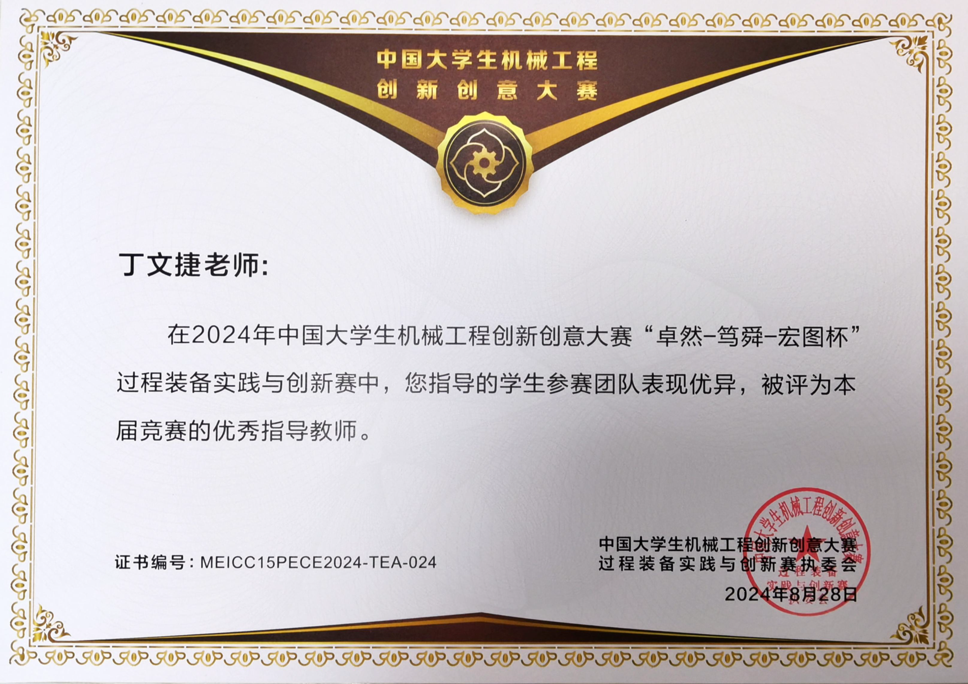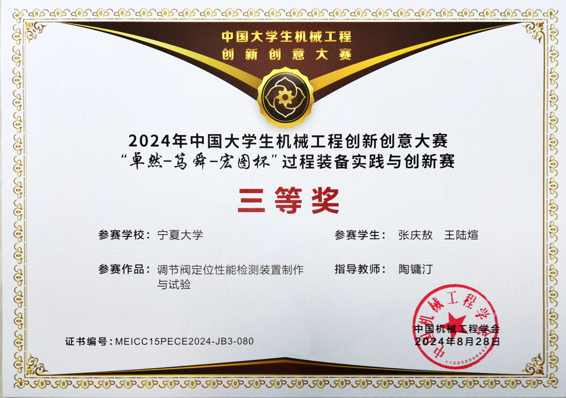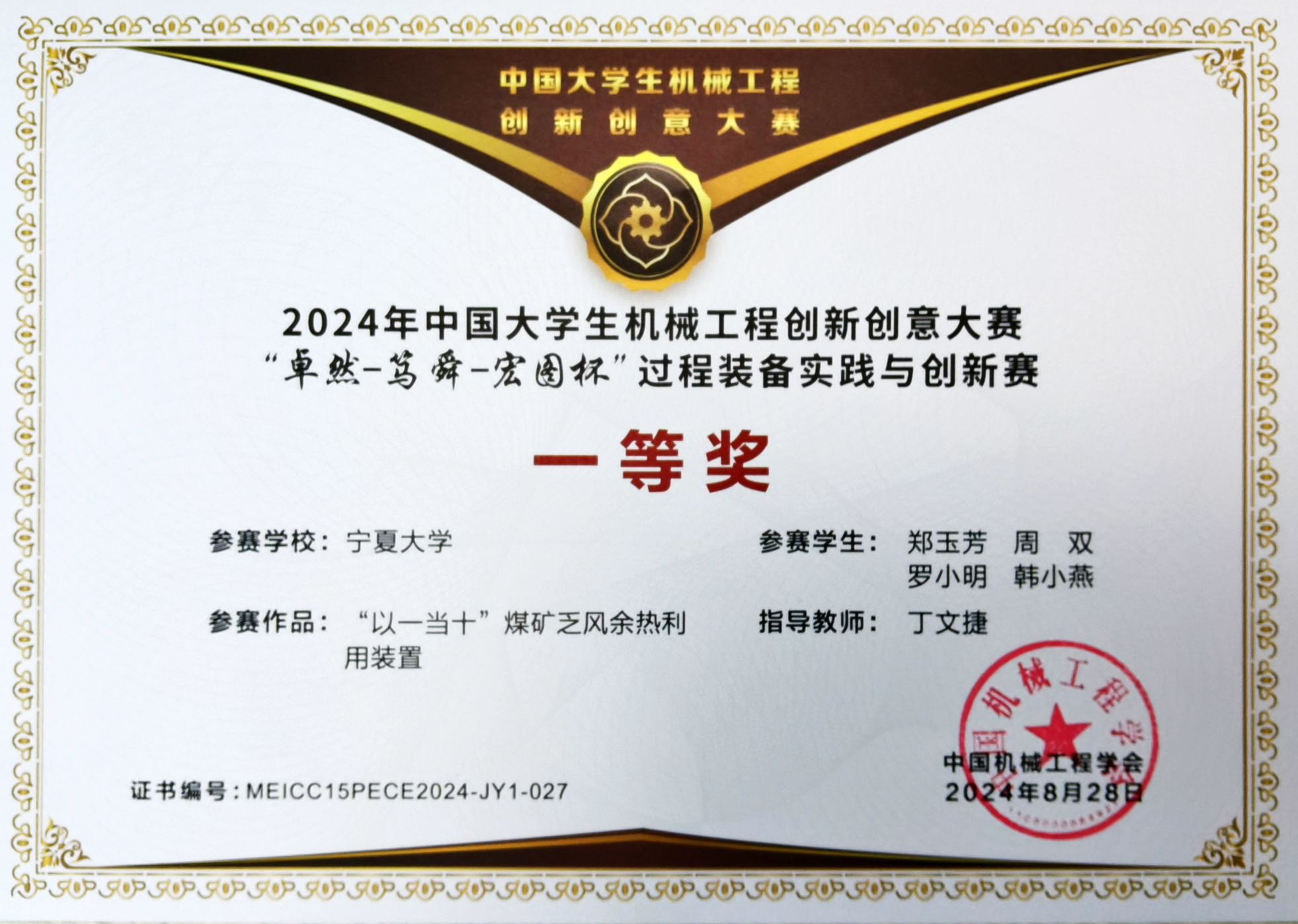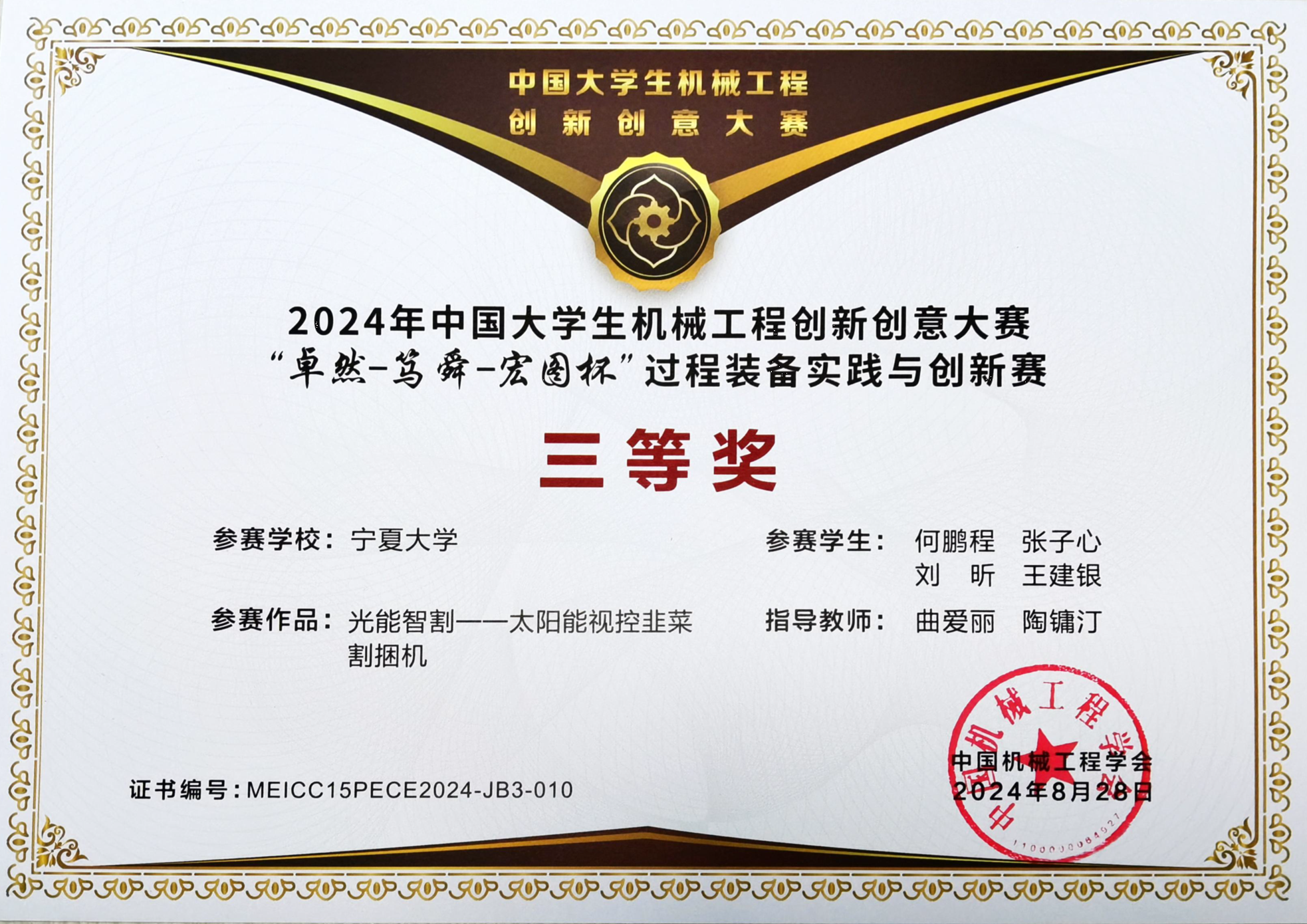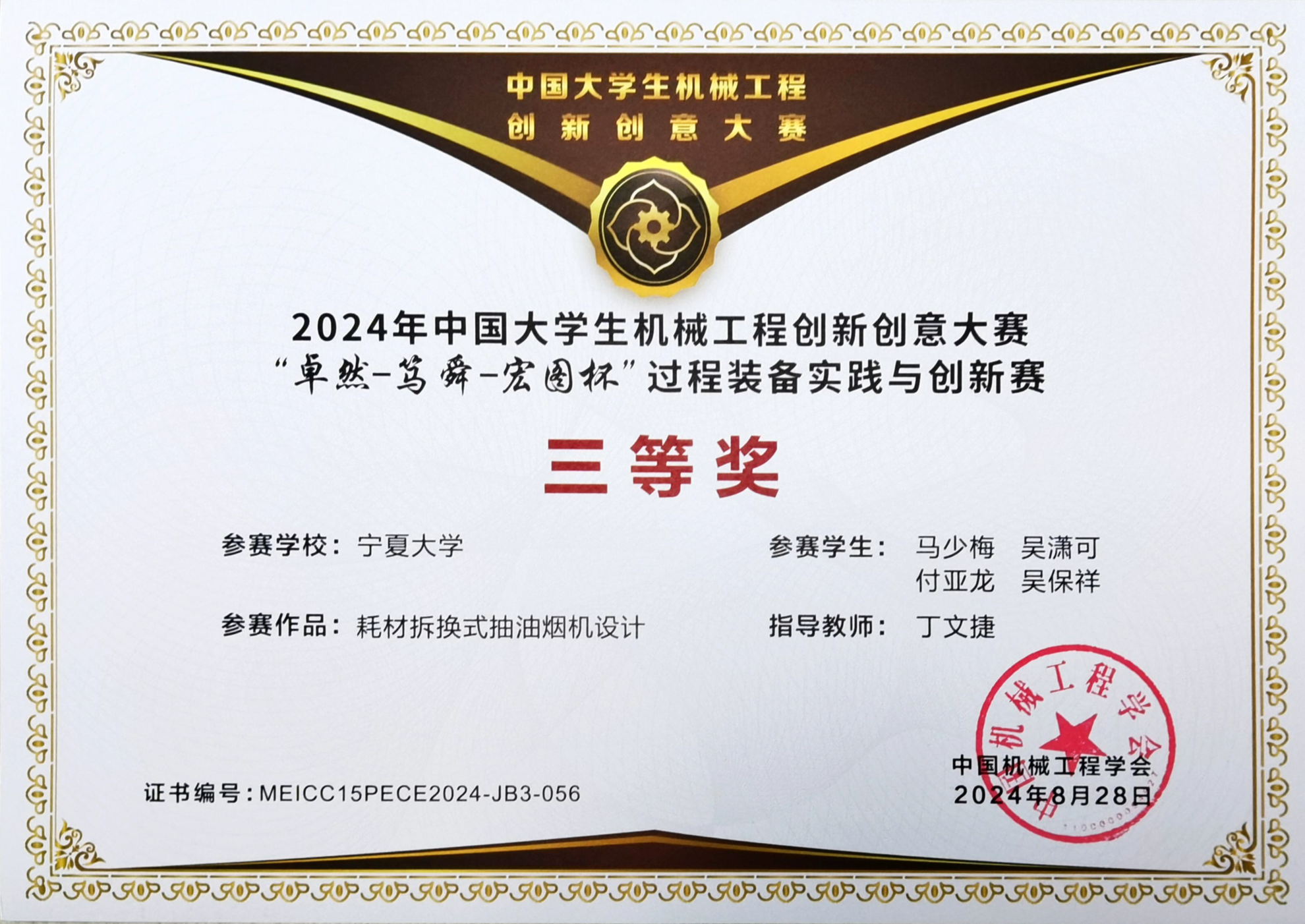 【beat365唯一官方网站新闻中心讯 机械工程学院】近日,由中国机械工程学会主办的2024年中国大学生机械工程创新创意大赛—“巨化-卓然-宏图杯”过程装备实践与创新赛评选结果揭晓,beat365官网机械工程学院丁文捷老师获本届竞赛优秀指导教师,研究生组丁文捷教师团队《“以一当十”煤矿乏风余热利用装置》获得国赛一等奖,本科生组丁文捷教师团队《耗材拆换式抽油烟机设计》,陶镛汀教师团队《调节阀定位性能检测装置的制作与试验》,曲爱丽、陶雍汀《光能智割—视控韭菜割捆领航者》获得三等奖。