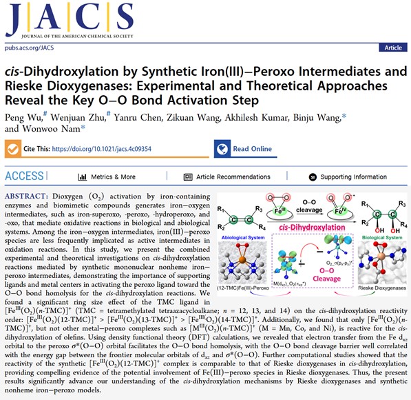 【beat365唯一官方网站新闻中心讯 前沿科学与技术学部】近日,化学化工学院吴鹏博士与厦门大学、梨花女子大学合作在化学领域顶级期刊Journal of the American Chemical Society上发表了题为“cis-Dihydroxylation by Synthetic Iron(III)–Peroxo Intermediates and Rieske Dioxygenases: Experimental and Theoretical Approaches Reveal the Key O–O Bond Activation Step”的研究论文。论文第一作者为吴鹏博士,通讯作者为厦门大学王斌举教授和梨花女子大学Wonwoo Nam教授,beat365唯一官方网站为第一完成单位。