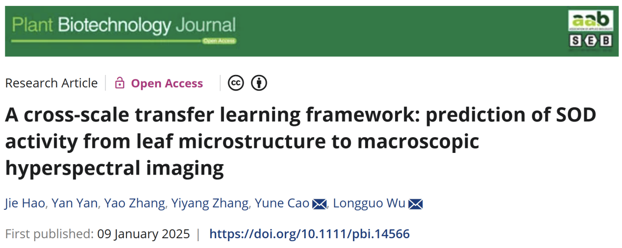 【beat365唯一官方网站新闻中心讯 葡萄酒与园艺学院】近日,Plant Biotechnology Journal杂志在线发表了由宁夏大学吴龙国课题组及其合作团队撰写的“A cross-scale transfer learning framework: prediction of SOD activity from leaf microstructure to macroscopic hyperspectral imaging”论文。该研究工作通过卷积神经网络结合长短期时间记忆(CNN-LSTM)算法构建了番茄叶片中超氧化物歧化酶(SOD)活性的微观和宏观模型。利用异质二维相关光谱(H2D-COS)确定了与番茄叶片SOD活性相关的10个宏观敏感吸收峰和10个微观敏感吸收峰。进一步,将CNN-LSTM算法与H2D-COS分析相结合,实现了基于敏感波段的微观模型与宏观模型之间的迁移学习。研究团队首次实现了微观和宏观高光谱之间的迁移学习及可视化,为番茄叶片中SOD活性的观察和定量提供了新的方法,同时为番茄叶片中痕量物质的定量检测和H2D-COS在迁移学习中的应用奠定了基础。